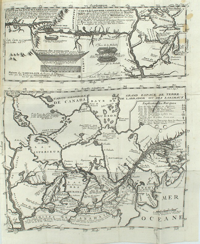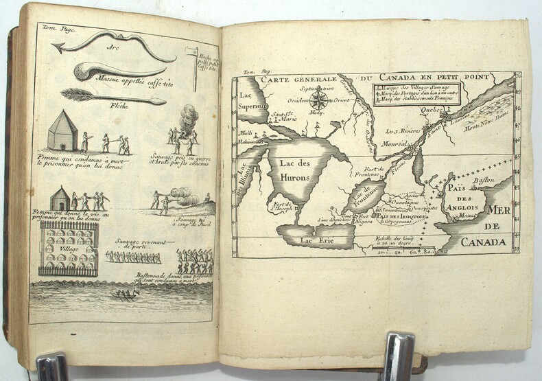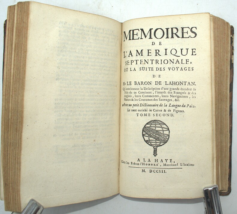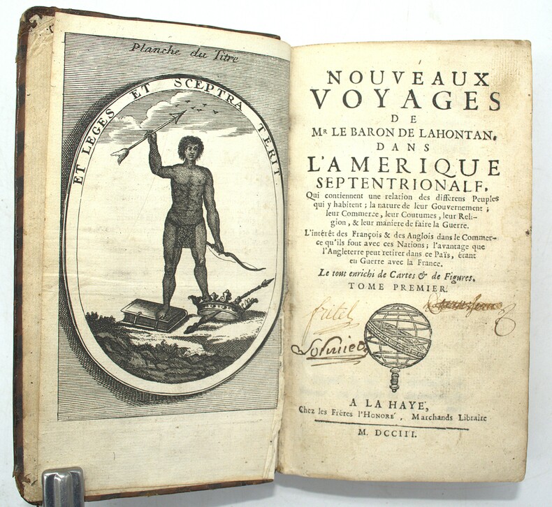 Louis Armand de Lom D’Arce, baron de Lahontan, homme d’armes, ethnographe et philosophe avant la lettre, parti en Amérique du Nord en 1683, il participa à la campagne française contre les Iroquois au lac Ontario en 1684 et fut désigné pour commander le Fort Saint-Joseph (aujourd'hui Niles, dans l’état du Michigan) en 1687. En 1688-89, il explora les rives des rivières Fox et Wisconsin ainsi que la région alentour de ce qui est aujourd'hui Green Bay, dans le Wisconsin. Il retourna en France en 1692, mais dut prendre la fuite vers le Portugal l'année suivante en raison d'un différend avec Jacques-François de Monbeton, gouverneur de Placentia (Plaisance) et d'Acadie. En 1703, il publia Nouveaux voyages de M. le baron de Lahontan dans l'Amérique septentrionale, ouvrage en deux volumes considéré comme le meilleur livre sur la Nouvelle France du XVIIe siècle. Le premier volume se présente sous la forme de 25 lettres contenant la description des lieux que Lahontan visita ainsi que les récits de ses voyages. Le second volume est la suite du premier, Mémoires de l’Amérique septentrionale, et décrit en détail la géographie, le commerce et les habitants de l'Amérique du Nord. Il se termine par Petit dictionnaire de la langue des sauvages, qui se compose principalement d'un glossaire de termes algonquins et de leurs équivalents français ainsi que de quelques termes hurons. Il influença l'opinion de penseurs du XVIIIe siècle tels que Voltaire, Montesquieu et Jonathan Swift. Lahontan came to New France in 1683 as captain of a regiment which he led in expeditions against the Iroquois. He traveled west in 1687 with Duluth and was given command of Fort St. Joseph on the St. Clair River. He left this post in 1688, venturing further west by the Fox-Wisconsin portage and reached the upper Mississippi.After his return he published his travelogues in the form of letters from 1703, which were very successful and caused a scandal, because his sympathy was with the savages and his criticism of European civilization and religion. The volume also includes a small dictionary of the "Language of the Wild", which begins on page 199 of the second volume. His work is considered one of the first comprehensive descriptions of the western part of the continent and influed the philosopher of the century. M1-Et2