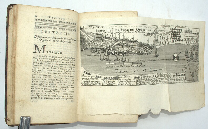 À La Haye, Chez les Frères L'Honoré, 1703. 2 tomes en un volume in-12, veau, dos à nerfs orné avec pièce de titre (reliure de l'époque) défauts d’usage. Rare édition de l'une des relations de voyage les plus importante pour l'histoire du Canada. - + 279 pp. & -- 220 + 8ff., Un frontispice et 24 planches ou cartes, certaines repliées, dont la « Carte Général de Canada ». Ex-libris manuscrit sur le titre. Première édition, troisième tirage.