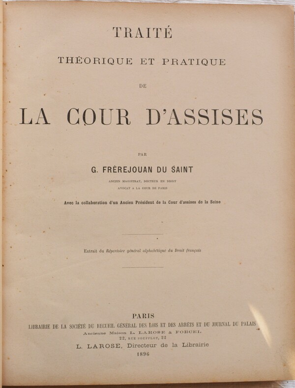 Ouvrage de référence consacré à l’organisation, aux compétences et aux procédures de la cour d’assises en France. L’auteur y expose à la fois les principes théoriques qui régissent cette juridiction criminelle et les aspects pratiques de son fonctionnement, depuis l’instruction jusqu’au jugement, en passant par le rôle des jurés, les droits de la défense et les modalités de l’audience. Il s’appuie sur la législation en vigueur, la jurisprudence et la doctrine, offrant ainsi un outil précieux pour les magistrats, avocats, étudiants et praticiens du droit pénal. G. Frérejouan du Saint fut juriste et collaborateur au Répertoire général alphabétique du Droit français, vaste entreprise de codification doctrinale publiée au XIXᵉ siècle. Il s’est spécialisé dans l’étude et la vulgarisation des matières pénales et procédurales, contribuant à rendre accessible au plus grand nombre les subtilités du droit criminel français. SSZ273