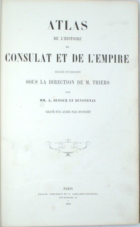 Atlas de l’histoire du Consulat et de l’Empire dressé et dessiné, sous la direction de M . THIERS, par MM A. DUFOUR et DUVOTENAY, gravé par sur acier par DYONNET. Paris LHEUREUX et Cie libraire éditeur 1864.In 4 demi cuir fauve glacé, à nerfs et à coins, pièces de titre cuir lie de vin et cuir vert, , fers à la grotesque, filets, dorés. Faux-titre, titre et suite de 66 cartes montées sur onglets, certaines sur double page, tranches marbrées .Rousseurs, principalement en marges ainsi qu’en début et fin de volume. Bien relié.