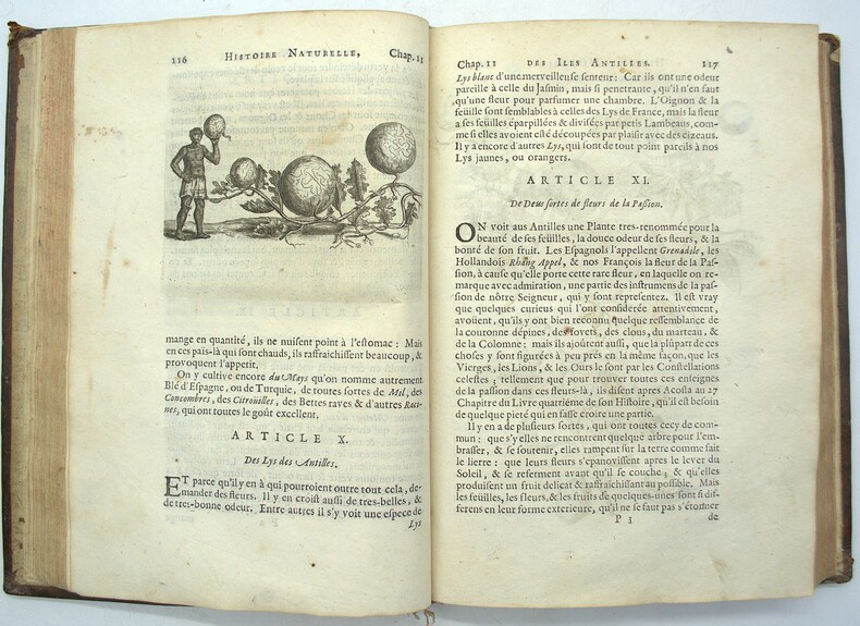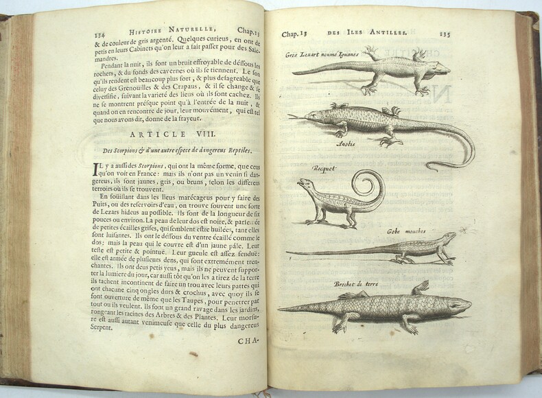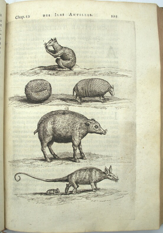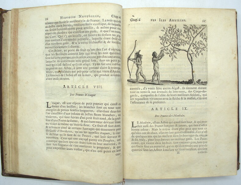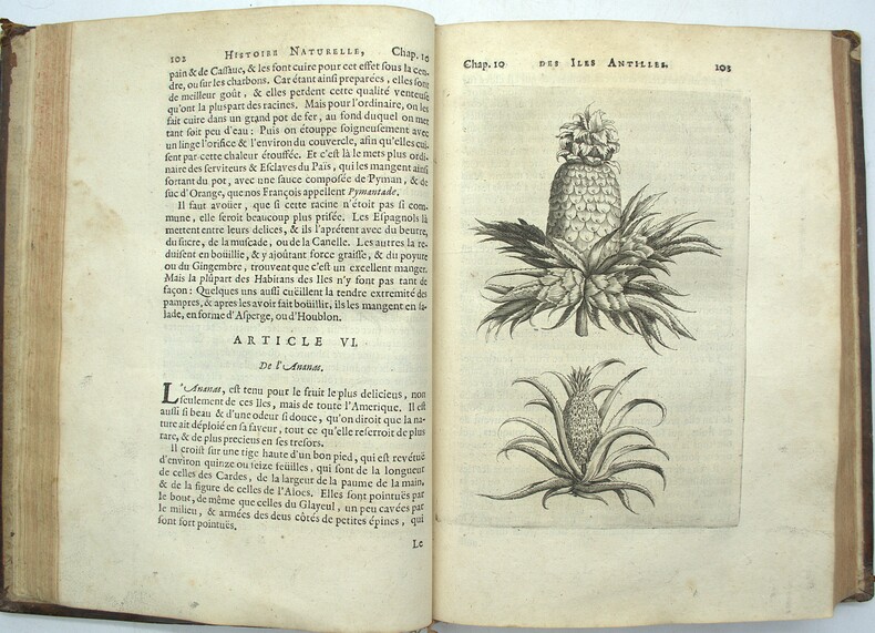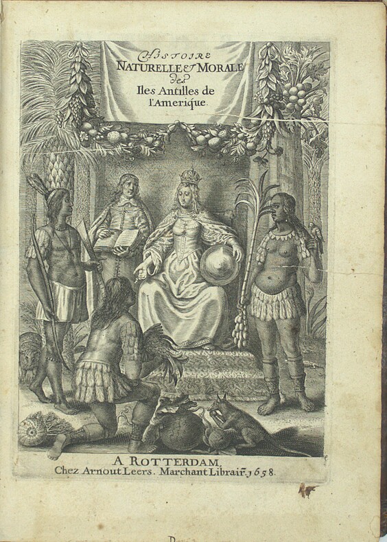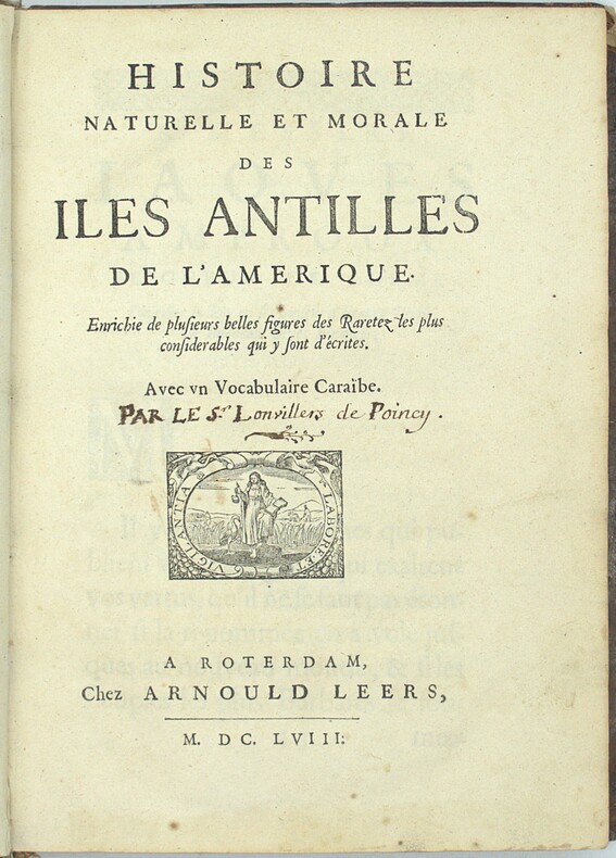 Édition originale rare de ce classique sur les Antilles, attribué au pasteur huguenot Charles de Rochefort. L’ouvrage se divise en deux parties : la première, consacrée à la faune et surtout à la flore tropicale, décrit avec précision de nombreuses espèces et fournit des gravures attrayantes, souvent enrichies de la présence de natives interagissant avec les plantes, ce qui leur confère un intérêt ethnographique singulier. La seconde partie s’attache aux aspects « moraux » et ethnologiques, offrant une des toutes premières descriptions détaillées des Indiens Caraïbes : leur origine et leurs migrations, leurs coutumes domestiques et guerrières, leur religion et leurs rites funéraires, leur savoir-faire en agriculture et en navigation, complétés par un vocabulaire caraïbe (pages 515 à 527) par le père Breton. Ouvrage longtemps controversé, Rochefort ayant utilisé des matériaux du manuscrit du dominicain Jean-Baptiste Du Tertre, ce qui donna lieu à une célèbre querelle entre les deux auteurs. Malgré ces polémiques, l’auteur, ayant vécu longtemps aux Antilles, notamment à Tobago, livre un témoignage direct qui confère à son récit une valeur historique et ethnographique de premier ordre, c’est aussi un témoignage de l’entreprise missionnaire et coloniale protestante. Ex-libris ms. « Lorenchet de Melonde », vraisemblablement Pierre Étienne Lorenchet (1701 - 1777), seigneur de Melonde, avocat au parlement de Paris, avec 7 lignes de références bibliographiques tracées de sa main, mars 1760. M7-B