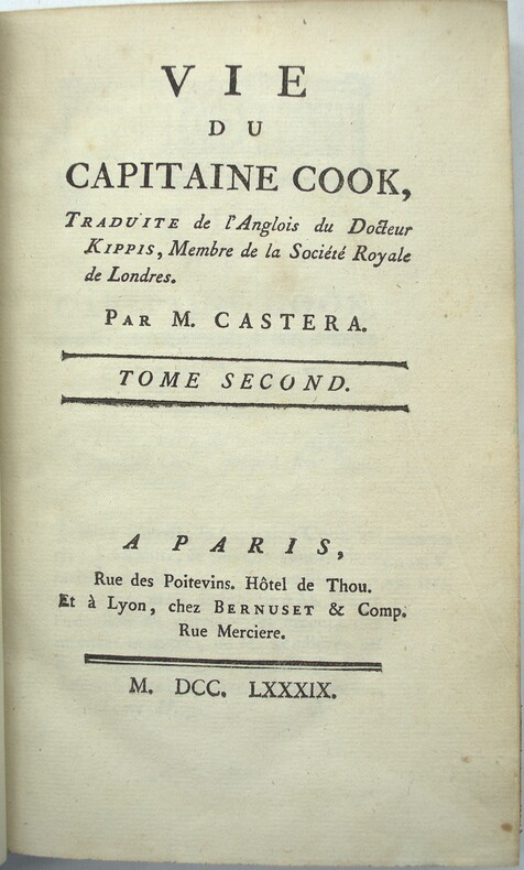 Vie du Capitaine Cook, traduite de l’Anglois… par M. Castera. Paris, Hôtel de Thou, 1789. 2 volumes in-8 (20 x 12 cm),relié pleine basane racinée époque, dos lisses ornés pièce de titre et de tomaison, bel état, tranche marbrée , liseré sur les tranches ,faux-titre , titre 397pp ,419pp ,bel exemplaire. Édition in-8 parue la même année que l'originale in-4. Première biographie de Cook. French edition of the first biography of James Cook, it provids a valuable account of the three voyages