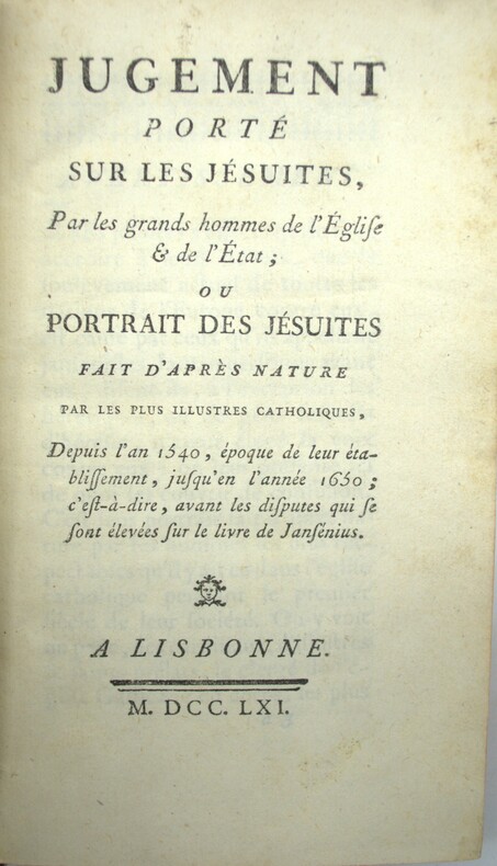 Rare édition lisboète de ce texte attribué à Pierre-Olivier Pinault, pamphlet historique et théologique retraçant l’histoire de la Compagnie de Jésus depuis sa fondation par Ignace de Loyola jusqu’au milieu du XVIIᵉ siècle. Sous une forme chronologique et polémique, l’auteur dénonce l’ambition temporelle et l’ingérence politique des jésuites, évoquant notamment l’exécution du père Madrigal, les expulsions successives de l’ordre et les décrets d’interdiction prononcés par plusieurs souverains catholiques. L’auteur s’appuie sur les témoignages des plus illustres catholiques — papes, cardinaux, prélats, souverains et théologiens — pour assurer son propos. Il cite notamment Paul IV, Sixte V, Clément VIII, Urbain VIII, ainsi que Philippe II d’Espagne et plusieurs dignitaires ecclésiastiques, afin de faire juger la Compagnie par les siens. Ouvrage emblématique de la littérature anti-jésuite du XVIIIᵉ siècle, publié dans le contexte des réformes du marquis de Pombal et de la montée des tensions qui aboutirent à l’expulsion des jésuites du Portugal. M8-A