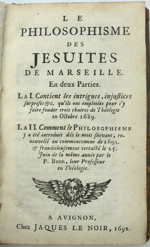 Édition originale de ce pamphlet anti-jésuite d’une grande rareté, attribué à Pierre de Porrade, docteur en théologie et chanoine du chapitre de Marseille. Témoignage direct des querelles religieuses et universitaires qui agitèrent la Provence à la fin du XVII siècle, l’ouvrage dénonce avec vigueur les intrigues et manœuvres par lesquelles les jésuites auraient obtenu la création de trois chaires de théologie à Marseille en 1689, imposant ensuite un enseignement jugé novateur et dangereux, qualifié de “philosophisme”. Porrade met en accusation la Compagnie, notamment le père Béon, professeur en théologie, accusé d’avoir renouvelé les doctrines suspectes de ses prédécesseurs. L’auteur, proche des milieux jansénistes provençaux, présente son texte comme un acte de défense du clergé séculier contre l’emprise intellectuelle des collèges jésuites. Imprimé à Avignon, cet ouvrage constitue une source capitale pour l’histoire des conflits ecclésiastiques et de la pédagogie religieuse au tournant du XVIII siècle. L’ouvrage est attribué tantôt à Gaspar Buon (d’après la notice BnF et certains catalogues modernes), tantôt à Pierre de Porrade, chanoine de Marseille, attribution affirmée par Achard (Histoire des hommes illustres de la Provence, t. II, Marseille, 1787, p. 425) et annotée dans notre exemplaire. M8-A