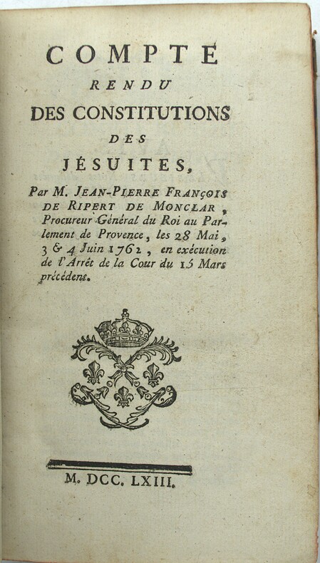 Édition complète de ce texte fondamental dans le procès politique et religieux intenté contre la Compagnie de Jésus en France. Jean-Pierre François de Ripert de Monclar, procureur général du roi au Parlement de Provence, y expose une analyse détaillée des Constitutions de l’ordre, démontrant, selon lui, leur incompatibilité avec les lois du royaume, la hiérarchie ecclésiastique et l’autorité du souverain. Ce vaste rapport, prononcé en audience publique à Aix entre mai et juin 1762, marque un tournant dans la lutte entre le pouvoir royal et les jésuites. Il précéda la série d’arrêts qui aboutirent à la suppression de la Compagnie en France (1764), puis à son expulsion de plusieurs pays catholiques. L’ouvrage est devenu un document-clé de la littérature parlementaire anti-jésuite, emblématique de la réaction gallicane et absolutiste contre l’autorité pontificale.