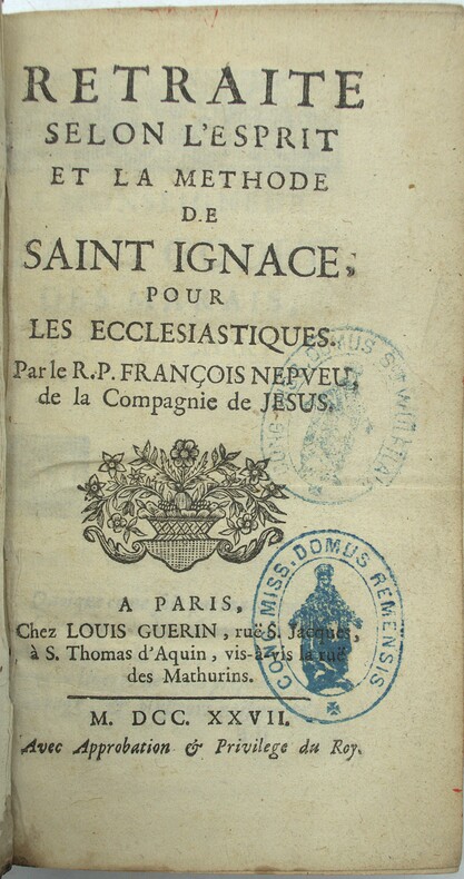 Édition originale du manuel spirituel rédigé par le père François Neveu, directeur de retraites et prédicateur jésuite. L’ouvrage transpose pour le clergé séculier la méthode des Exercices spirituels d’Ignace de Loyola, avec une adaptation au ministère sacerdotal. Très diffusé dans les maisons religieuses et les séminaires, ce texte témoigne du rayonnement de la spiritualité ignatienne au début du XVIIIe siècle. M8-A