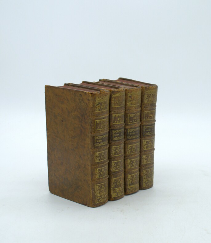 A Paris, Gissey.., 1750 à 1752. 4 volumes petit in/8, reliure plein veau moucheté du temps, dos à nerfs à caissons et pièce de titre fauve, tranches rouges, bandeaux, lettrines historiées, tome 1 : lij ff. de page de titre, table et discours préliminaire, 58 p. de table géographique des noms des royaumes, 489 p., 2 ff. de privilèges - tome 2 : page de titre, 1 ff. de table, 519 p. - tome 3 : xiv ff. de discours préliminaire, 540 p., 2 pages dépliantes sur les généalogies de gengiskhaniath et de Tamerlan - tome 4 : 4 ff. de page de titre et préliminaire, 525 p. 3 Coiffes abîmées, quelques mors légèrement ouverts, coins et bords inférieurs usés, tomaisons illisibles, tome 1 : dernier feuillet (p. 489) avec un manque de papier au centre (fin du texte et approbation), tome 2 : erreur de pagination (p.58 au lieu de 85). Rares taches et rousseurs.