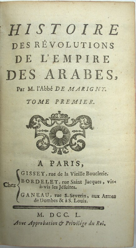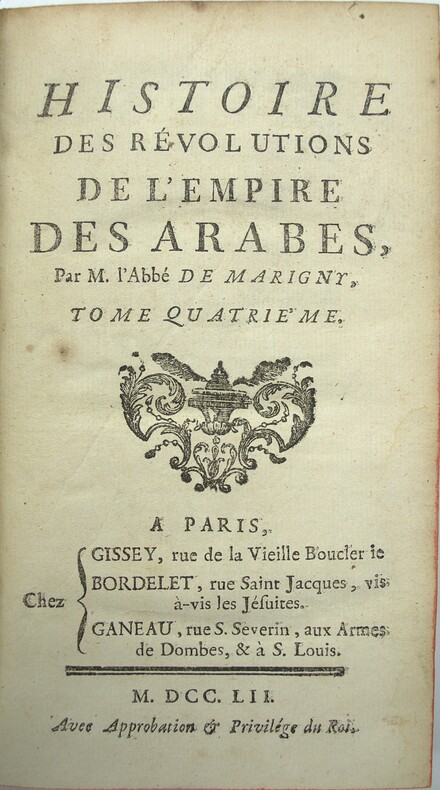 Contient une généalogie de Mahomet suivie d’une suite chronologique des califes successeurs du prophète et de celle des empereurs de Constantinople. Chadenat 1818, Querard T 5. Brunet Table 1583/84.4 vol. small 8 vo, contemporary full mottled calf, ribbed spine with gilt panels and yellow labels, red edges, headpieces and initial letters, vol 1 : [52], [58], 489 p. [2] - vol 2 : [2], 519 p. - vol 3 : [14], 540 p. - vol 4 : [4], 525 p. Flaws : 3 headspine worn, some joint slightly split, corners & borders rubbed, 2 small wormholes on the binding, lack of paper on the last sheet of the vol. 1 (affecting text and approbation) - error of pagination : 58 instead of 85 of the vol.2 . Occasional foxing and spotting.