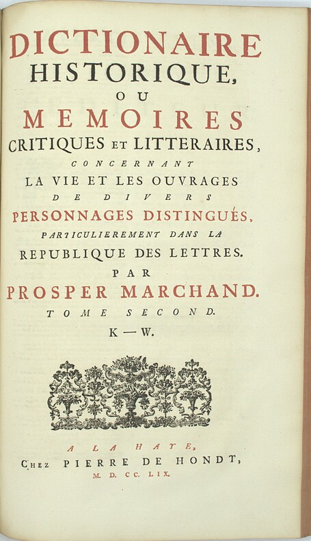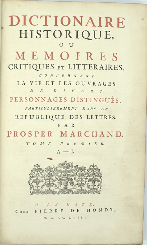 Édition originale posthume de ce vaste dictionnaire biographique et bibliographique rédigé par Prosper Marchand (1678-1756), libraire et philologue établi à La Haye. Il y travailla plus de trente ans, dans l’intention première d’en faire la continuation du Dictionnaire historique et critique de Pierre Bayle, qu’il admirait et dont il partageait la méthode. L’ouvrage réunit ses notices sur les écrivains, savants et imprimeurs des XVII et XVIII siècles, enrichies de remarques critiques et de précisions bibliographiques souvent inédites. Publié d’après ses manuscrits, il demeure une source importante pour l’histoire du livre et des milieux intellectuels protestants en Europe. Mezz-et0 Brunet III, 1440 ; Quérard VI, 330 ; Barbier I, 1087.