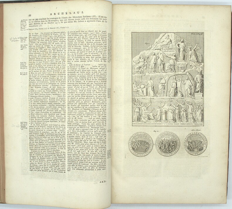 La Haye, Pierre de Hondt, 1758-1759. 2 tomes en 1 vol. in-folio (41 × 26 cm). 4ff.-330pp.-3ff., 2ff.-328pp.-14ff. Reliure de l’époque en veau brun, dos à nerfs orné, pièce de titre rouge, tranches rouges, coins émoussés, coiffes absentes, dos manquant, frottements, épidermures, premier plat fragile, mouillure angulaire, quelques brunissures.