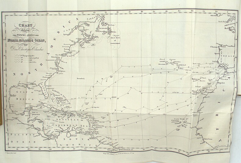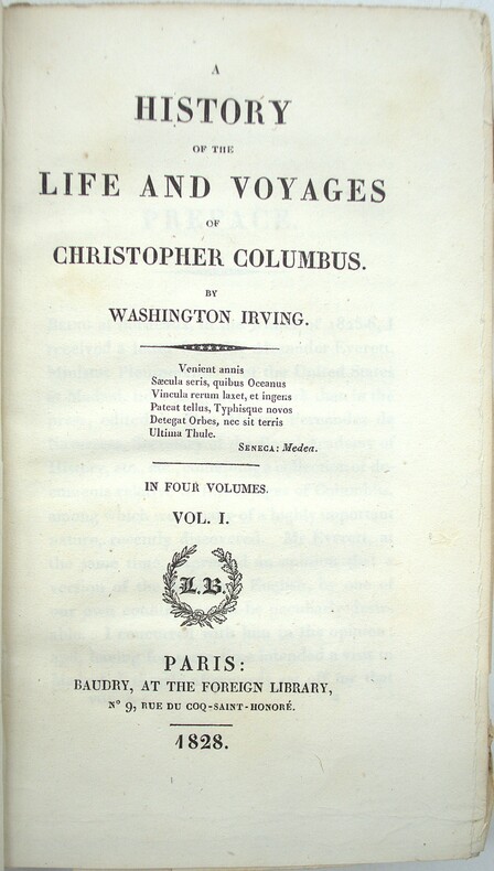 FIRST BRITISH EDITION, preceding the first American edition of the same year. One of the first modern biographies of Christopher Columbus, considered to be one of the first examples of American historical fiction. Irving was invited to Madrid to translate Spanish-language source material on Columbus into English, and decided to write his biography instead. He worked closely with Alexander von Humboldt, who had recently returned from his South American voyage and could provide deep knowledge of the geography of the Americas. This was also the first of Irving's works to be published under his own name. Washington Irving was an american essayst and historian with full acess of the massive library of spanish history. P2-6C