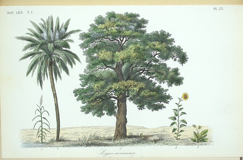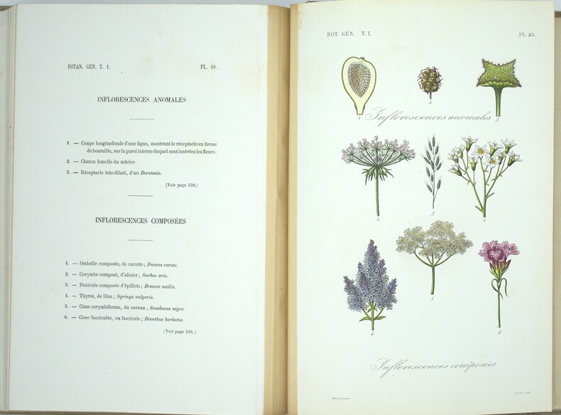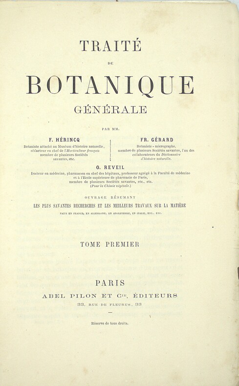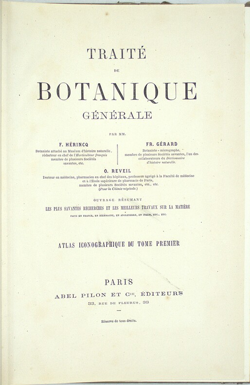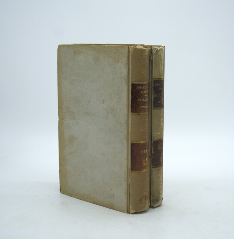 Édition originale du 1er tome et de son atlas de ce joli ouvrage sur la botanique, formant une des parties de l’imposante publication des auteurs dans les années 1860-1870, intitulée Le Règne végétal. Elle est illustrée de 53 planches montées sur onglets, gravées par Pierre, Lagesse, Lebrun, Corbier, Oudet et Noël, et rehaussées au pinceau par Gérard, Maubert et Legrand. Un texte explicatif accompagne chaque planche en regard. L’ouvrage résume les plus savantes recherches et les meilleurs travaux sur les végétaux au XIX siècle. Il a été composé par les botanistes Hérincq et Gérard et le pharmacien Réveil. Ch1-F