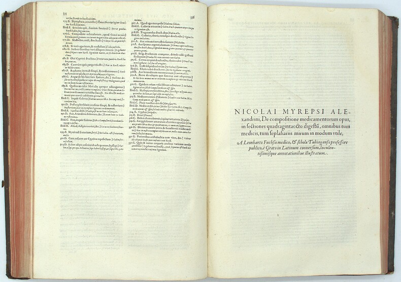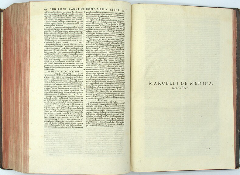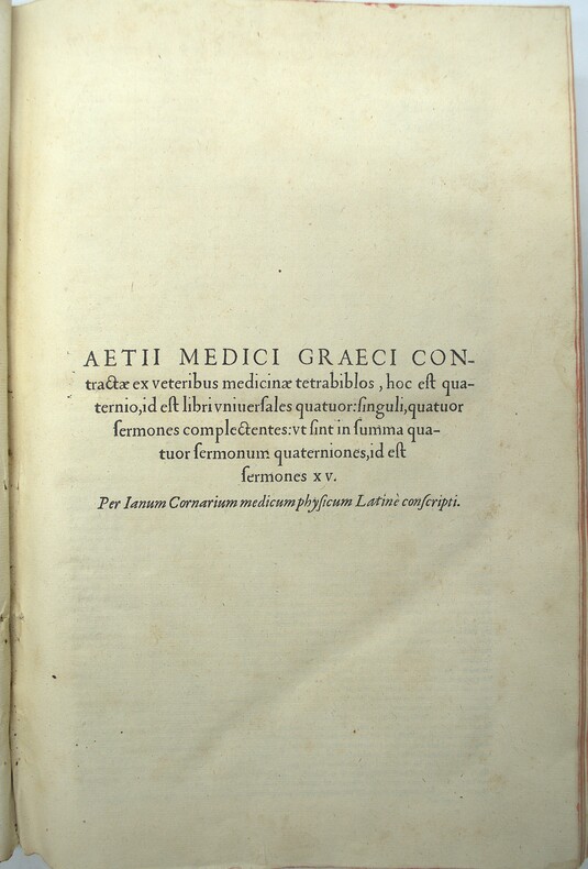 1567 2 in-folio Complet, tel que décrit par Brunet. Le 1er volume commence avec 4 ff. préliminaires (titre, épitre dédicatoire d’H. Estienne et préface de J.P. Crassus). On trouve ensuite : 1°) Aretaeus, 346 col. Suivies de 6 ff. séparés pour l’index d’Alexander Trallianus et la préface d’Aegineta ; 2°) P. Aegineta, col. 347 à 768 ; 3°) Actuarius, 846 col. ; 4°) Celcius, 434 col. Le 2e volume présente les 3 parties restantes: 5°) Oribasisus, 697 col. ; 6°) Aetius, 866 col. ; 7°) Le volume se termine par 54 ff. non chiffrés, qui contiennent l’index et des notes sur Hippocrate ; l’errata se trouve sur le 54e et dernier feuillet.