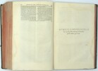 Edition rare et estimée, publiée par Henri Estienne, de ce recueil ou collection médicale de textes latins des principaux médecins de l’antiquité et du Moyen-Age.Estienne a ainsi réuni les textes d’Aretee de Capadoce, Rufus d’Ephese, Alexandre de Tralles, Paul d’Egine, Oribase, Aetius d’Amide, Théophile Protospathaire, Joannes Actuarius, Celse, Scribonus Largus, Empiricus Marcellus et Serenus.L’édition comporte 1 figure sur bois gravé dans le texte de la col. 50 de l’Aegineta dans le tome I et 43 figures sur bois gravé dans le texte illustrant les traités De Laqueis et De machinamentis d’Oribase, dans les col. 154 à 198 de l’Oribasius (tome II).Basane brune, dos à nerfs ornés, tranches rouges, reliure du XVIIIe frottée, restaurations aux coins, aux mors et aux coiffes. Quelques mouillures et épidermures.Table manuscrite (encre noire) au verso de la première garde (sans doute de la main de Raussin, qui a écrit une note relative à Estienne au bas du titre du tome I).Provenance : Ex-libris gravé et armorié, collé sur les premiers contreplats, de Louis-Jérôme Raussin (1721-1798), docteur régent de la Faculté de Médecine de Reims entre 1756 et 1781. L’exemplaire présente d’autres ex-libris manuscrits, à l’encre, sur les pages de titre : Charles du Castel, médecin (XVIe) ; Pierre le Pescheur, doyen de la faculté de Médecine de Reims (fin XVIIe) ; Nicolas de Mailly, de la Faculté de Reims (XVIIIe) ; René-Marie Briau (1810-1886), bibliothécaire de l’Académie de Médecine de Paris ; Edouard-Paul Grimonpont (1913-1995), pharmacien