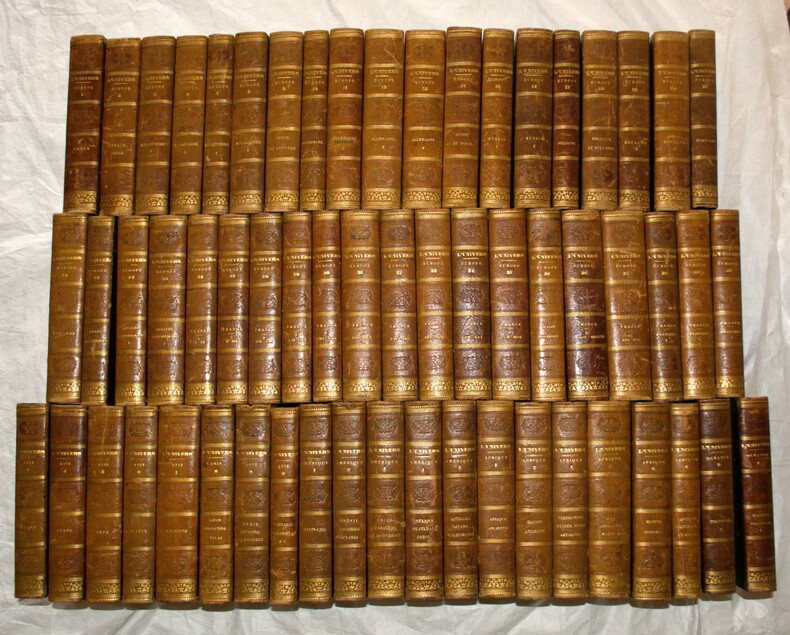 Monumentale encyclopédie géographique et historique, publiée sur près de trente ans sous la direction de Firmin-Didot par les meilleurs spécialistes, historiens et géographes du temps, et illustrée de nombreuses de gravures et cartes. L’ensemble comprend la quasi-totalité de la section européenne (38 vol. sur 43), dont la France complète avec ses trois atlas et deux annales ; manquent Îles de la Grèce (Lacroix, 1863), Provinces danubiennes et roumaines (Chopin et Ubicini, 1856), Grèce depuis la conquête romaine (Brunet de Presle et Blanchet, 1860) et le second volume de L’Italie ancienne (Duruy, Filon, Lacroix et Yanoski, 1851). Amérique complète (5 vol.), Afrique quasi complète (6 vol. sur 7, manque Algérie), Océanie (2 vol. sur 3), Asie (8 vol. sur 12, manquent Chaldée, Assyrie, Médie – Hoefer, 1852 ; Chine moderne – Pauthier, 1853 ; Asie mineure – Le Bas, 1863 ; Asie mineure, description géographique, historique et archéologique – Texier, 1862). Rare ensemble substantiel de cette vaste entreprise éditoriale, souvent rencontré très incomplet ou dispersé.