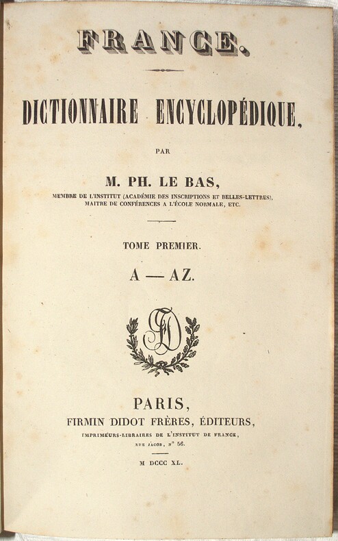 1838 Paris, Didot frères, 1838, 2 volumes cartonnage ed.in-8°, IV (titre avec marque de l'éditeur) 495p.+ 2 cartes (Germanie ancienne, par Th. Duvotenay) + 480 p. (texte sur deux colonnes) + 200 planches gravées sur acier h.-t.(numérotées de 1 à 200), quelques rousseurs, reliure cartonnage ed., Usures ou accroc aux coiffes de tête, rousseurs sans gravité, bon ex.