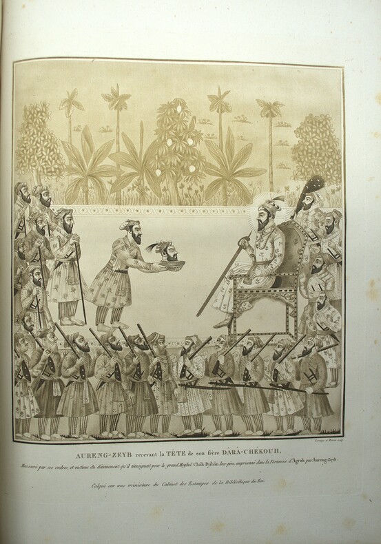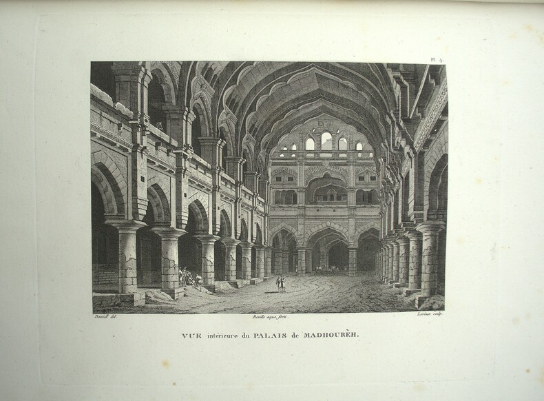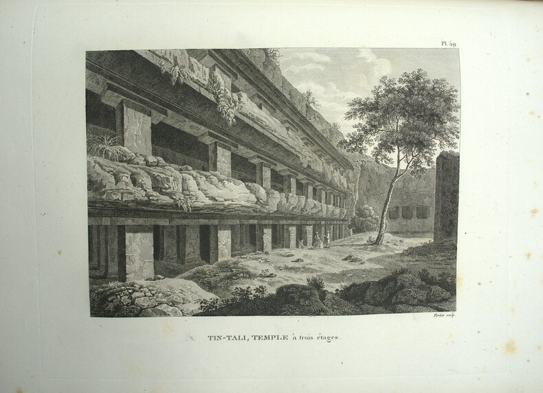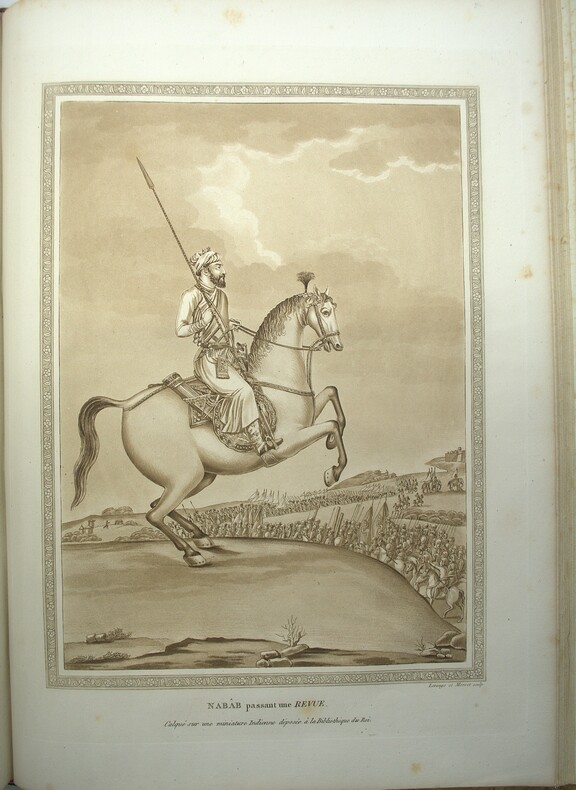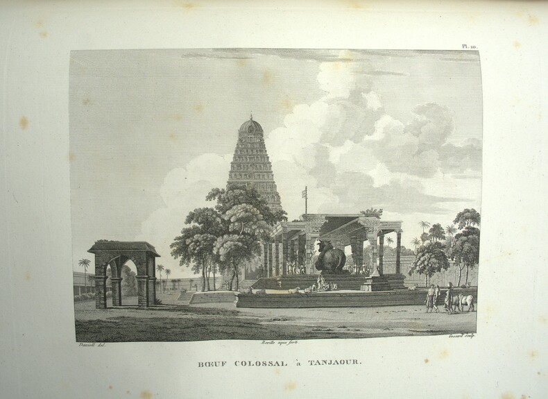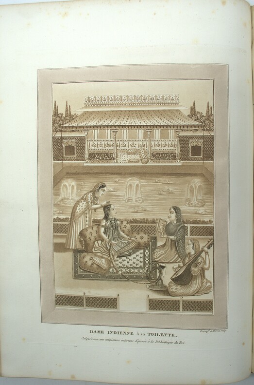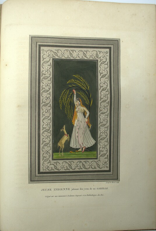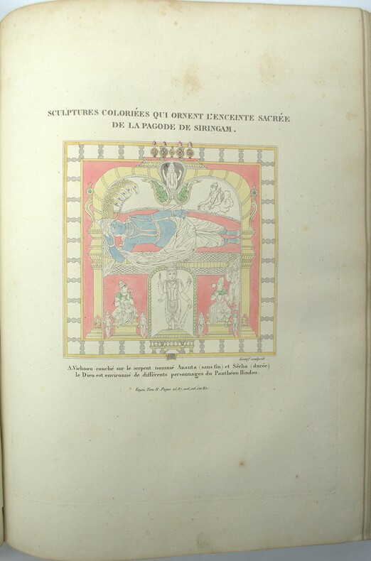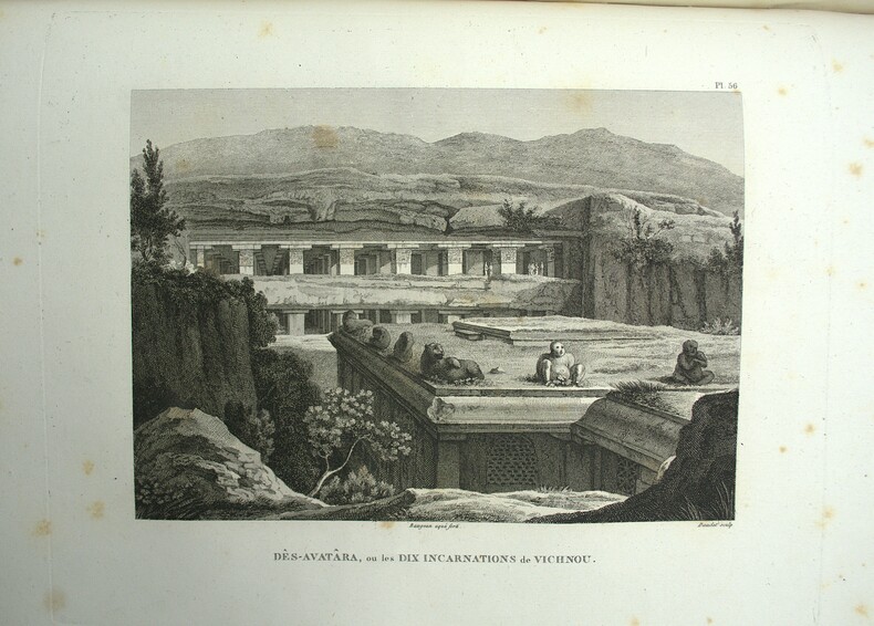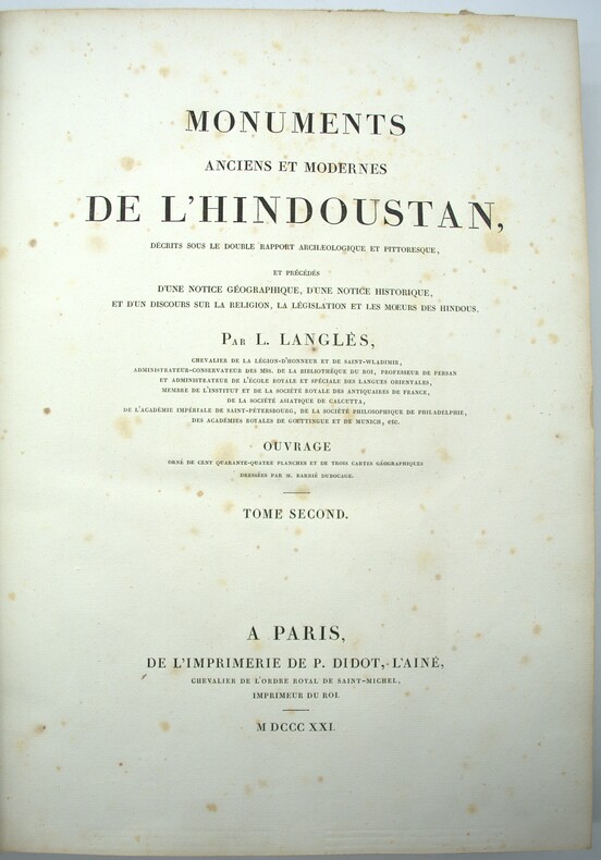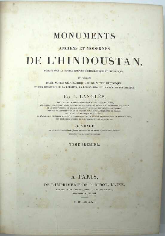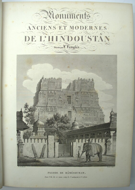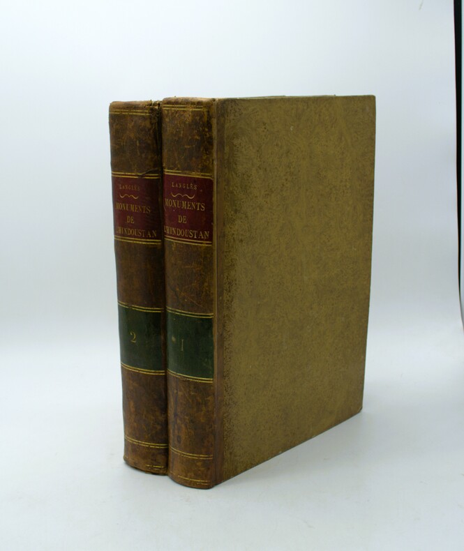 Édition originale de cet « ouvrage très recherché », selon Chadenat L’abondante illustration se compose d’un frontispice gravé, d’un tableau sur double-page, de 3 cartes aux frontières coloriées et de 144 planches gravées dont 17 en couleurs. La Notice géographique de l’Hindoustan occupe 164 pages du premier volume ; elle se divise en quatre chapitres. Le premier chapitre traite de l’étendue et des limites de l’Hindoustan, de ses divisions naturelles et politiques à différentes époques, ainsi que de l’étymologie du nom sous lequel on désigne cette région. Les deux derniers chapitres présentent la description des principales provinces et villes de l’Inde. Le Discours sur la religion, la législation, les mœurs et les usages des Hindous s’étend sur 64 pages : une brève notice sur les langues les plus connues de la presqu’île et sur les plus anciens textes sanskrits y précède l’exposé du système mythologique des Brahmanes. Enfin, la Notice historique de la presqu’île de l’Inde clôt le premier volume. Publiée sous la direction de Louis-Mathieu Langlès (1763-1824), orientaliste et conservateur des manuscrits orientaux à la Bibliothèque nationale, et achevée après sa mort par Abel-Rémusat (1788-1832). L’ouvrage rassemble des vues et relevés d’édifices religieux et civils de l’Inde, d’après les dessins d’artistes britanniques tels que William et Thomas Daniell, James Wales ou William Hodges, accompagnés d’un texte historique et archéologique. Published under the direction of Louis-Mathieu Langlès (1763–1824), Orientalist and curator of Oriental manuscripts at the Bibliothèque nationale, and completed after his death by Abel-Rémusat (1788–1832). The work brings together views and architectural surveys of Indian religious and civil monuments after drawings by British artists such as William and Thomas Daniell, James Wales, and William Hodges, accompanied by historical and archaeological commentary. Brunet III, 820; Chadenat 5234