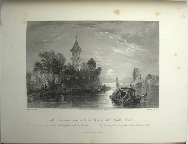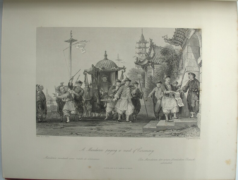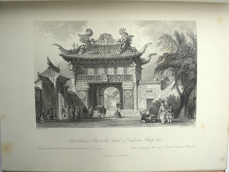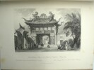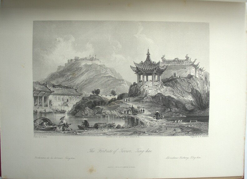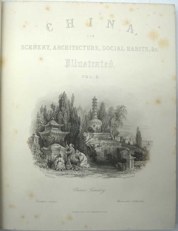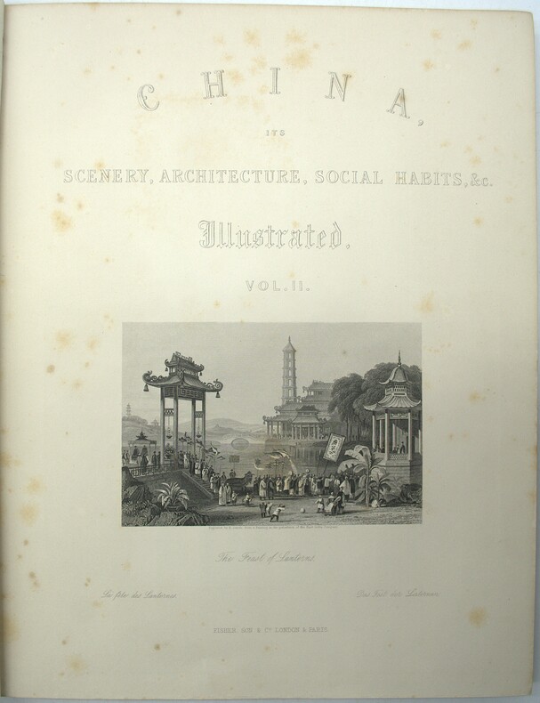 Ouvrage illustrant les monuments, paysages et scènes de la vie quotidienne en Chine, d’après les croquis de Thomas Allom et le texte de Clément Pellé. Publié simultanément à Paris et à Londres par Fisher, il offre l’un des témoignages les plus complets sur la Chine du milieu du XIX siècle. Publisher’s red cloth binding, covers decorated in blind and gilt, spine with gilt tooling, all edges gilt. Clean interior, light scattered foxing affecting some plates, minor rubbing to the spine tome 1, spine slightly sunned. Four engraved titles and 123 steel-engraved plates after Thomas Allom, within ornamental borders and with captions, engraved by various artists (H. Adlard, C. Bentley, J. Sands, etc.), complete according to the tables, with three duplicated plates.
