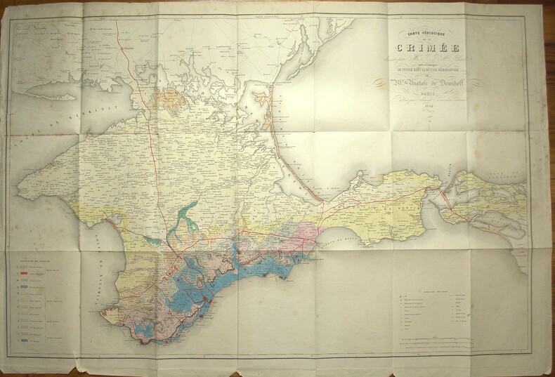 Bourdin et Cie.Editeurs.1840.In-8 demi-relié.621 p.64 dessins de Raffet sous serpente.Demi-veau au dos à caissons avec encadrement et filets dorés.Tranches dorées.Atlas in-8 en demi-cuir vert sombre contenant la carte géologique rempliée de la Crimée et la carte du voyage dans la Russie méridionale publiées en 1835.Cartes en couleurs.Très bel état.