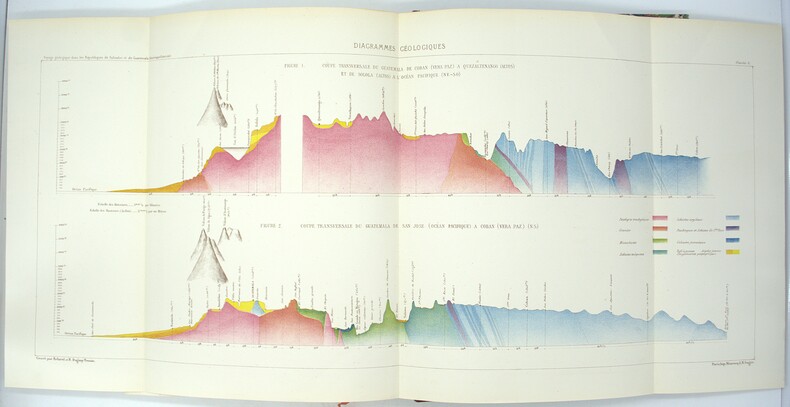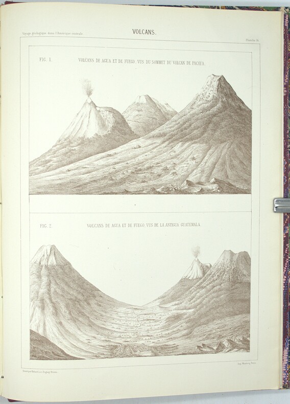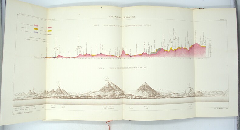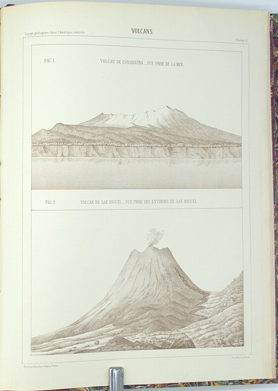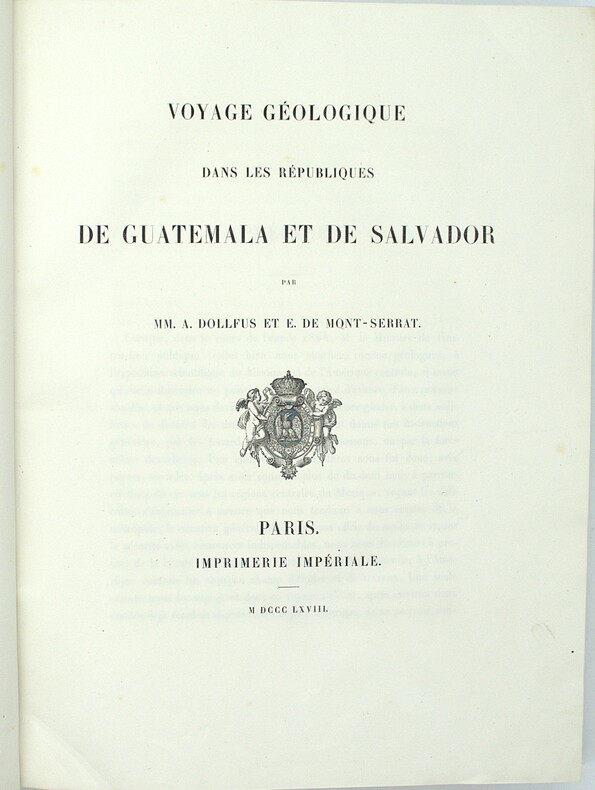 Édition originale de l’un des meilleurs ouvrages de vulcanologie du 19eme siècle. Leur mission, débuta à Oaxaca et Tehuantepec, puis se poursuivit au Guatemala par Suchiate, Escuintla et Antigua, avant de gagner Guatemala-la-Nueva et les régions volcaniques d’Amatitlán, de l’Agua, du Fuego et du Pacaya. Dans ces zones, les auteurs effectuèrent des relevés topographiques et géologiques d’une rare précision, observant la nature des laves, la stratification des cônes, les émanations gazeuses et les effets des éruptions récentes, notamment celles du Fuego. Ils poursuivirent ensuite vers Santa Ana et San Salvador, jusqu’à la côte du Pacifique par La Libertad. Leurs travaux, appuyés sur cartes et planches lithographiées en couleurs d’une remarquable exactitude, constituent l’une des premières descriptions scientifiques cohérentes du système volcanique guatémaltèque et salvadorien, alliant observation directe, rigueur géologique et restitution graphique fidèle. (Chadenat, 51, « Ouvrage très important, tiré à petit nombre ») Auguste Dollfus et Eugène de Mont-Serrat furent attachés en 1864 à la Commission scientifique française du Mexique, expédition organisée sous Napoléon III sur le modèle de celle de Morée et d’Algérie. Issued from the French Scientific Commission of Mexico (1864), Auguste Dollfus and Eugène de Mont-Serrat’s Voyage géologique dans les Républiques de Guatemala et de Salvador (Paris, Imprimerie Impériale, 1868) records their route from Oaxaca and Tehuantepec through Guatemala and El Salvador. The authors conducted detailed geological and volcanic surveys in the regions of Amatitlán, Agua, Fuego and Pacaya, analysing lavas, strata, and recent eruptions with exceptional accuracy. Their maps and coloured lithographs stand among the earliest and most precise representations of the Central American volcanic system.