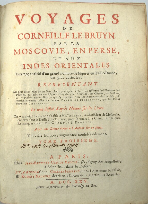 Paris & Rouen, J.B.C Bauche, Ferrand, Machuel, 1725. 1 Volume in-4° (5) (25x19cm), 3ff.-520pp.-6ff., illustré de 2 cartes et 12 gravures (13 ), relié veau époque, dos à nerfs avec pièce de titre et tomaison, coiffes abimées, coins usés, frottements, déchirure aux cartes, ex-libris manuscrit au titre.