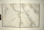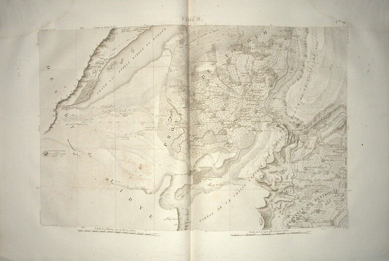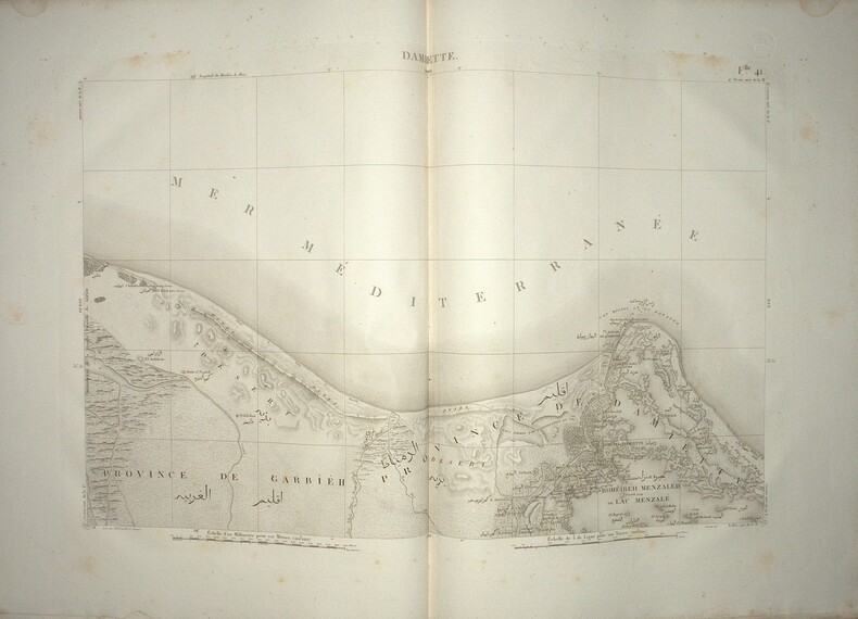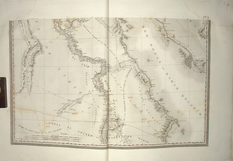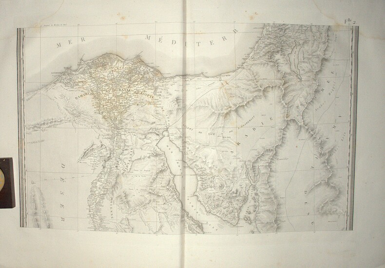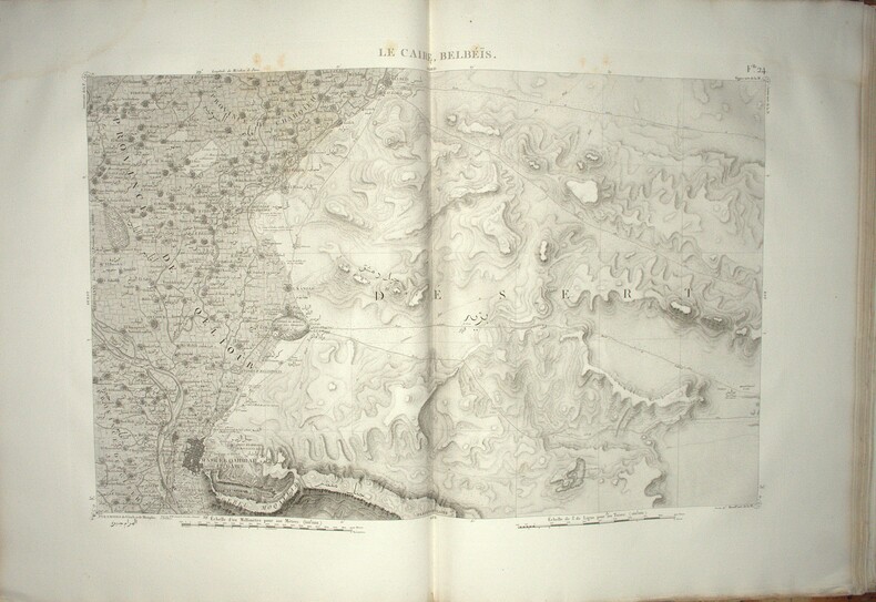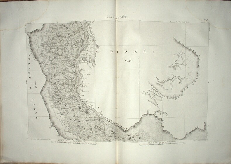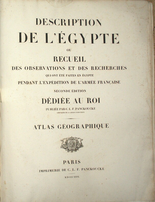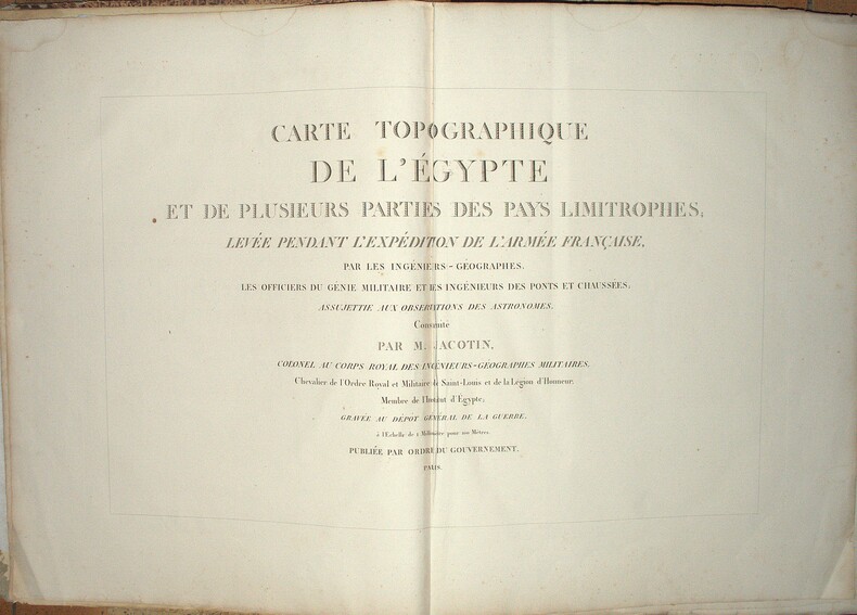 Titre, second titre en double page, table d’assemblage, tableau des Caractères Topographiques et Alphabet Harmonique, Carte géographique réduite en 3 feuilles datée de 1822 et 47 feuilles en double page, reprenant l’ensemble des levés topographiques établis sous la direction de Jacotin durant l’Expédition d’Égypte ; la majorité des feuilles sont en double page, avec 6 en simple page, l’ensemble imprimé en très grand format, cuvette 85 × 56 cm, impressions 49 × 82 cm et 51 × 82 cm selon les segments. Les planches détaillent la cartographie du Delta, de la vallée du Nil jusqu’à la Nubie, des principaux centres urbains et des zones archéologiques, constituant l’atlas géographique spécifique à l’édition Panckoucke.