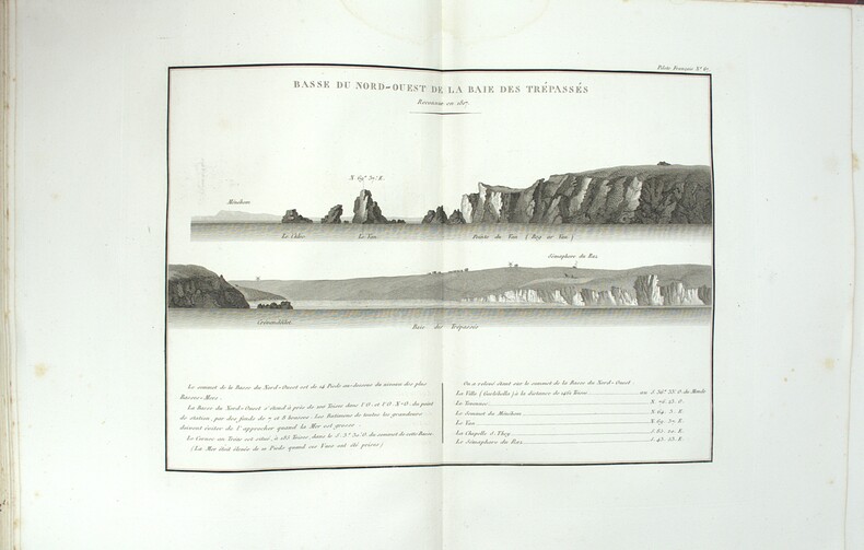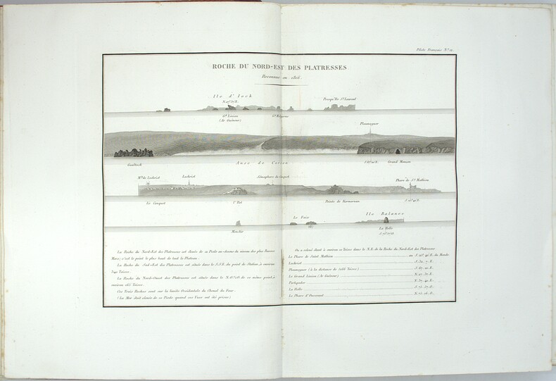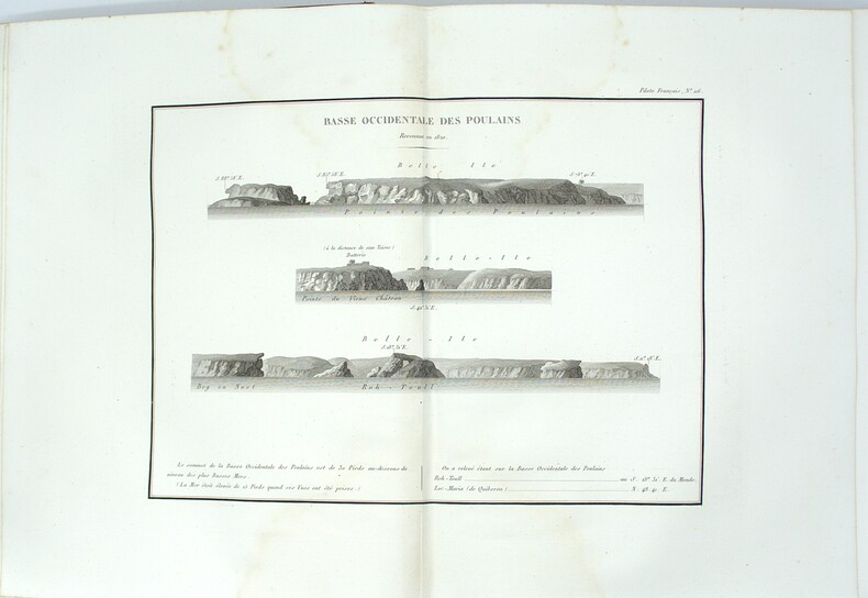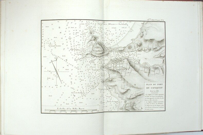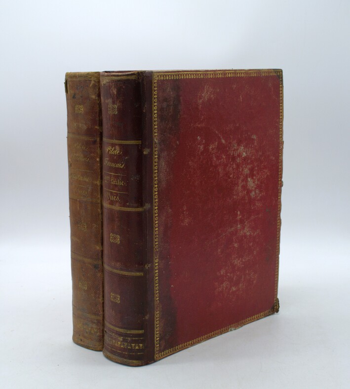 Édition originale des deux premières parties de cette œuvre monumentale, considérée comme le premier atlas nautique moderne produit en France, issue des vastes campagnes de reconnaissance hydrographique dirigées par Beautemps-Beaupré. Publié entre 1822 et 1843, Le Pilote français se compose de six parties. Chaque partie comprenait des cartes marines générales de la zone concernée, des cartes à plus grande échelle d’une grande précision, parfois accompagnées de plans de détail, ainsi que des vues des principaux dangers avec alignements et relevés topographiques très rigoureux. Des tableaux de marées complétaient cet ensemble destiné à la navigation.