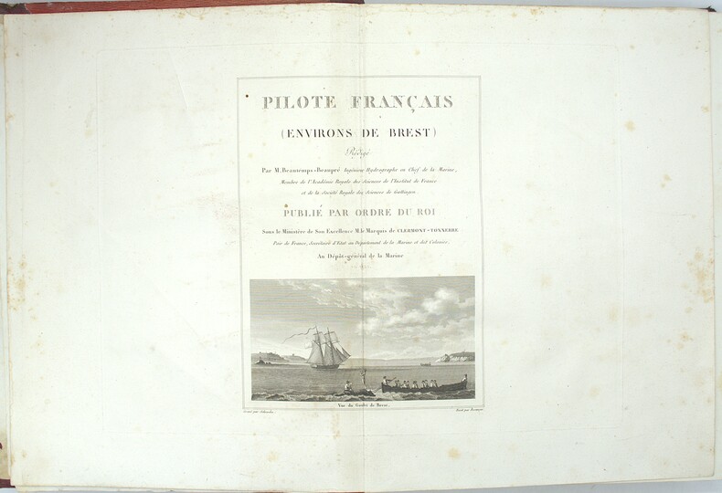 Paris, Au Dépôt général de la Marine, 1822 et 1829. 2 volumes grands in-4 (34,5 × 27 cm), demi-maroquin à coins, dos lisses avec titres et tomaisons, guirlandes aux plats. Deux volumes de vues uniquement, toutes gravées et montées sur onglets. Premier volume : faux-titre, titre gravé illustré d’une Vue du Goulet de Brest, gravée par Schroeder, table des planches, et 91 vues à double page. Second volume : faux-titre, table des planches, 91 vues à double page, numérotées 79 à 169, et 20 planches de marées.