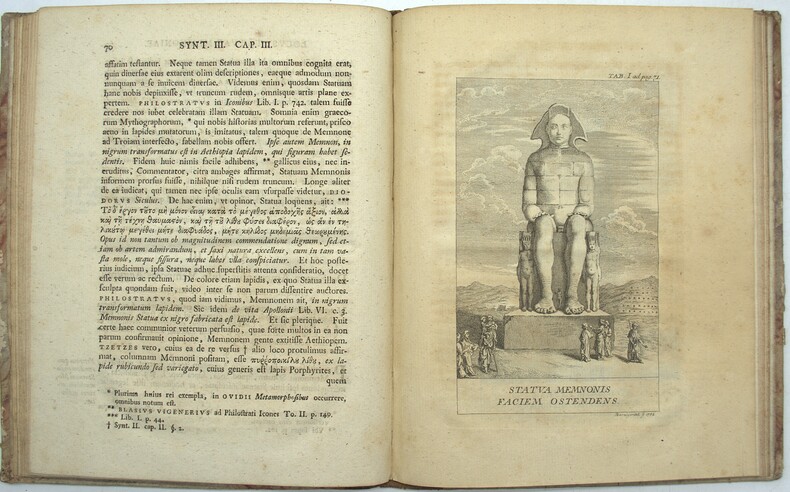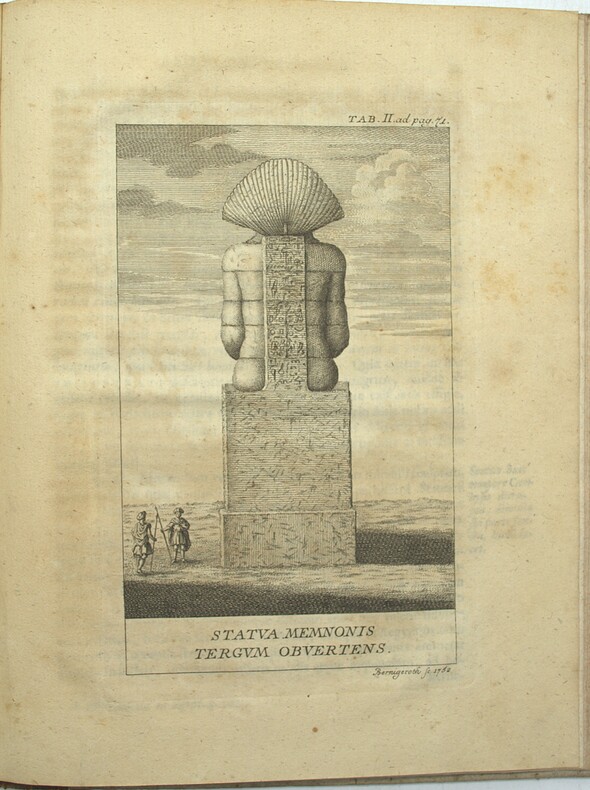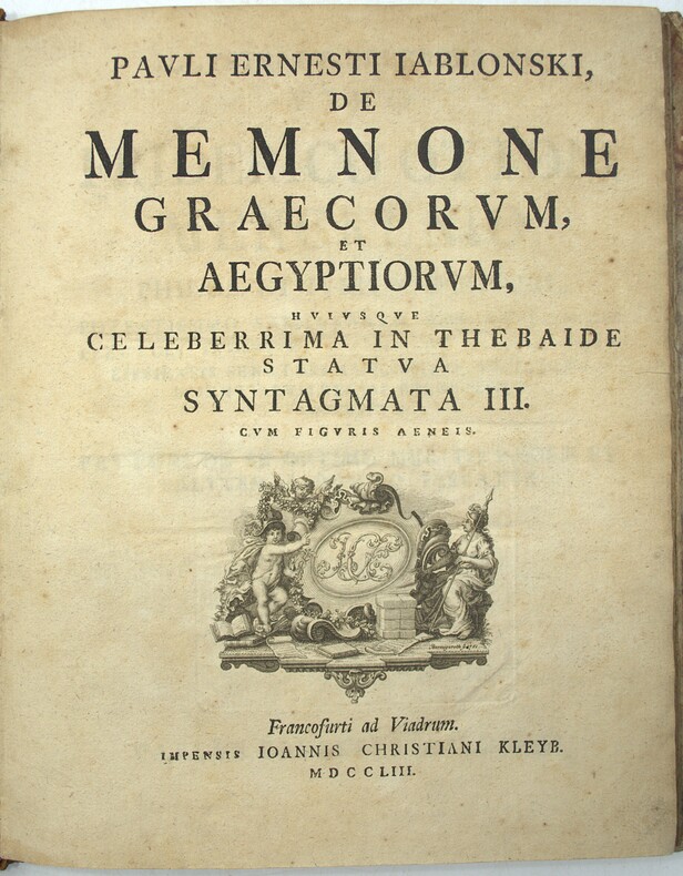 Ouvrage entièrement consacré au Colosse de Memnon, monument majeur de la Thèbes antique, correspondant aux statues colossales du pharaon Amenhotep III. Jablonski y étudie l’origine de l’identification grecque de la statue à Memnon, héros de la mythologie, ainsi que le phénomène antique de la « voix de Memnon », signalé par de nombreux auteurs classiques et réputé se manifester à l’aube sur le colosse nord. L’auteur confronte les témoignages des écrivains grecs et latins aux données historiques et monumentales connues au XVIII siècle, cherchant à expliquer rationnellement le phénomène sonore tout en replaçant la statue dans son contexte égyptien originel. Les gravures sur cuivre accompagnant le texte figurent le colosse, son implantation à Thèbes et divers détails épigraphiques ou comparatifs. Ch-1B