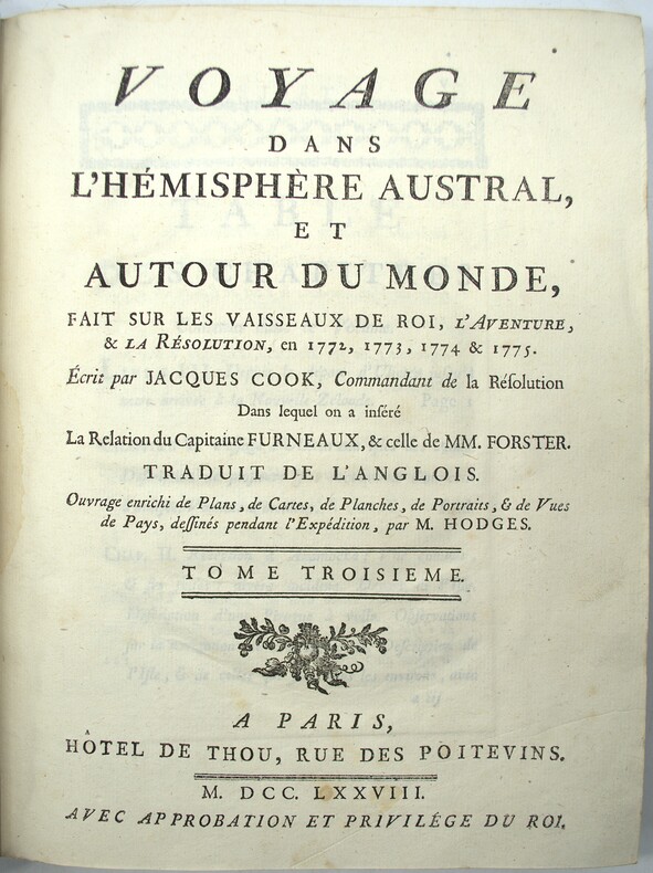 Troisième volume du second voyage de Cook relatant le départ d’Angleterre jusqu’à son arrivée à Tahiti, passant par le Cap et la Nouvelle Zélande.