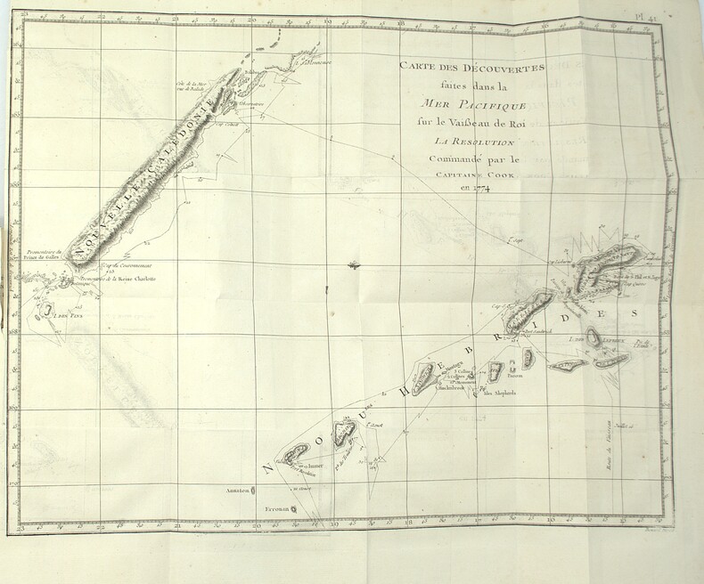 Premier volume du second voyage de Cook relatant le départ d’Angleterre jusqu’à son arrivée à Tahiti, passant par le Cap et la Nouvelle Zélande. P1-Et3
