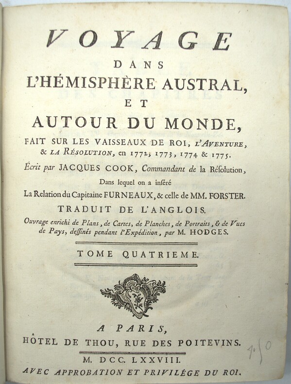 Troisième volume du second voyage de Cook relatant le départ d’Angleterre jusqu’à son arrivée à Tahiti, passant par le Cap et la Nouvelle Zélande.