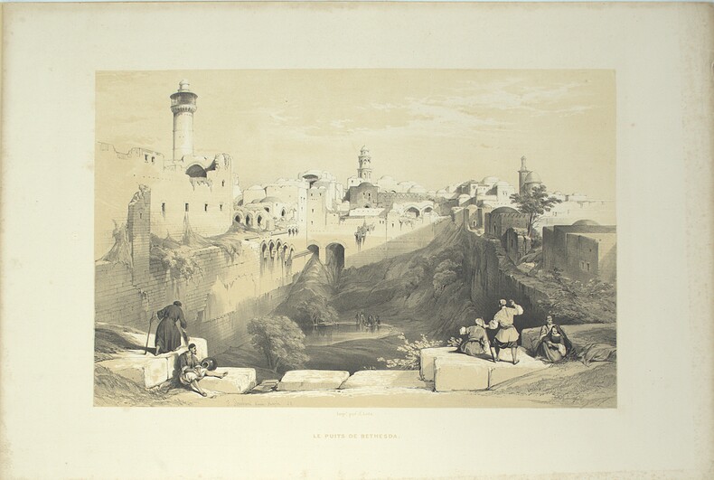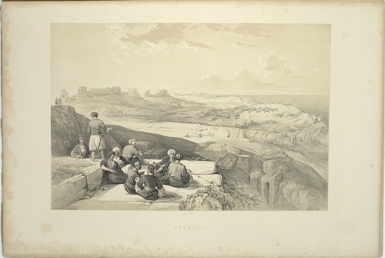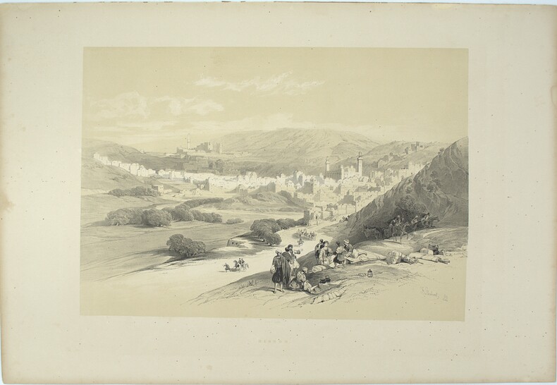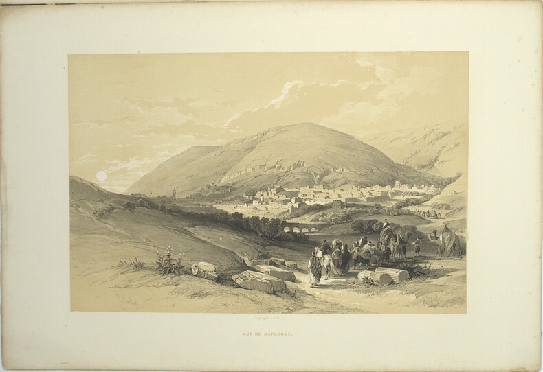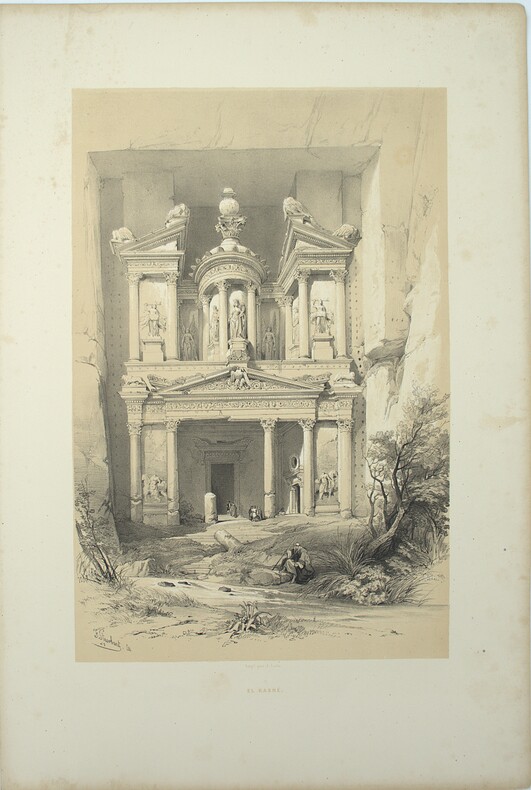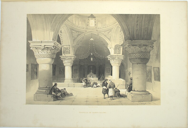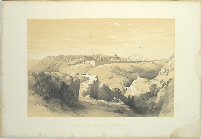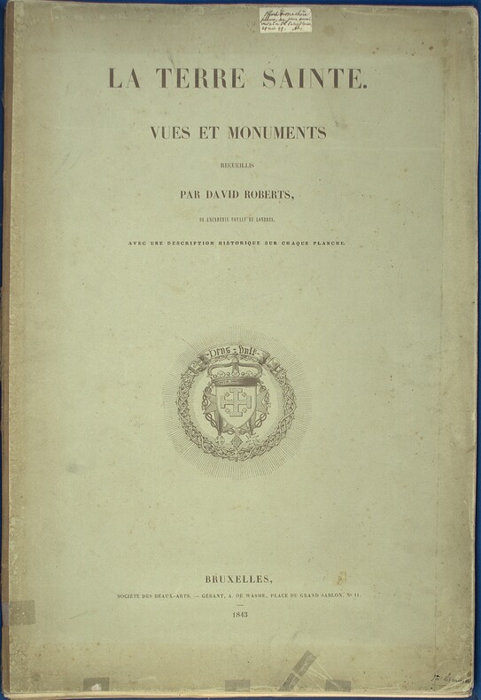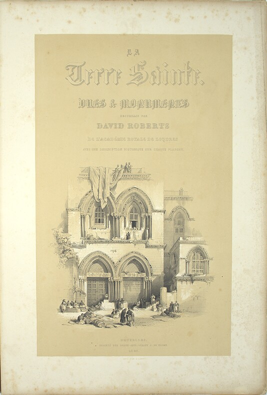 Première édition française. Sélection des plus belles planches tirées des deux premiers volumes de la grande publication londonienne de David Roberts, The Holy Land, Syria, Idumea, Arabia, Egypt & Nubia (1842–1849), ici présentées en version française abrégée. La composition se concentre sur la Terre Sainte proprement dite, avec une prédominance de vues de Jérusalem et des principaux sanctuaires chrétiens, mais également de Bethléem, Jéricho, Tibériade, Nazareth, Gaza, Naplouse, Ascalon, etc. Le texte d’accompagnement est une adaptation en français, sous une forme condensée, des notices de l’édition originale anglaise. Les lithographies sont exécutées par Louis Haghe selon la même technique de lithographie teintée (tinted lithography), gage d’une grande qualité d’interprétation graphique. Les vignettes de titres et les encadrements sont attribués à Franz Stroobant. L’ouvrage fut publié en livraisons ; les plats imprimés d’origine de ces fascicules sont aujourd’hui rarement conservés. David Roberts demeure l’un des artistes britanniques les plus célèbres pour ses représentations du Proche-Orient au XIXe siècle, et cette édition bruxelloise a contribué à diffuser son œuvre dans le monde francophone. Références : Abbey, Travel 385, p. 337 – Brunet IV, 1331 – Gay 25 – Ibrahim-Hilmy II, 176.