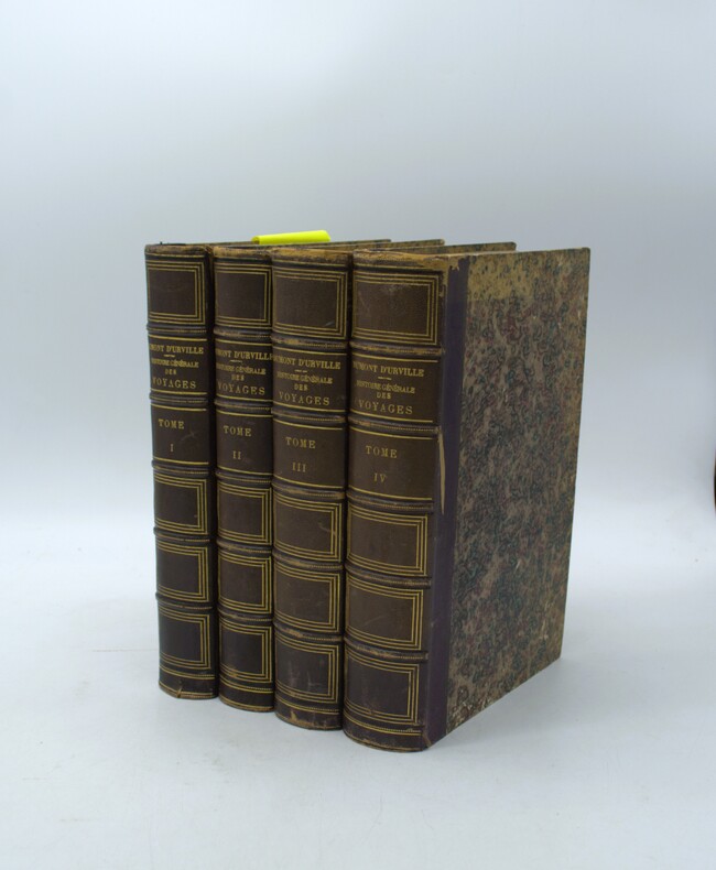 Paris, Furne, 1859. 4 volumes grand in-8, demi chagrin, dos à nerfs orné avec titre, petits frottements, rousseurs. Illustré d'un frontispice, de 44 planches hors texte et deux cartes dépliantes en couleurs (Itinéraire du voyage et Tahiti) pour le Voyage de Dumont d'Urville. Tome III : 612 pages avec 27 hors texte et 2 cartes d'Amériques. Tome IV: 692 pages avec 25 hors-texte et 2 cartes (Asie et Afrique).