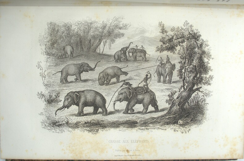 Édition illustrée réunissant quatre grands ensembles de récits de découvertes et de voyages. Les deux premiers volumes sont consacrés au voyage autour du monde de Dumont d’Urville à bord de l’Astrolabe et de la Zélée (1837-1840) : circumnavigation scientifique comprenant les escales en Afrique australe, l’Australie, la Tasmanie, la Nouvelle-Zélande, divers archipels du Pacifique et les navigations australes qui conduisirent à la reconnaissance de la Terre Adélie. Le troisième volume, rédigé par Alcide d’Orbigny, présente une histoire des voyages entrepris aux Amériques depuis Christophe Colomb jusqu’au milieu du XIX siècle, offrant un tableau historique, politique et géographique du Nouveau Monde : Antilles, Guyane, Colombie, Brésil, Argentine, Mexique, États-Unis, Canada, régions arctiques, Groenland et Islande. Le quatrième volume, rédigé par Éyries et Jacobs, rassemble des récits de voyage concernant l’Asie et l’Afrique : parcours en Sibérie et Tartarie chinoise (Oural, Tobolsk, Irkoutsk, Baïkal), régions frontières de la Chine, voyages en Inde, Afghanistan, Perse, Turquie, Syrie, Arabie et Proche-Orient, ainsi que relations concernant l’Afrique du Nord (Maroc, Algérie, Égypte), l’Abyssinie, le Soudan, Tombouctou et diverses régions d’Afrique orientale et intérieure. Ch-1B