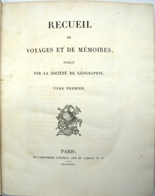 Paris, Everat, 1824, in-4 (260x210mm), 2ff-LIV-568pp-1ff , avec en fin d’ouvrage la liste des membres de la Société de Géographie, relié demi toile, dos lisse avec étiquette de titre, éditeur et tomaison, frottements aux plats et étiquette usée, vieille mouillure claire en coin, piqures.