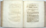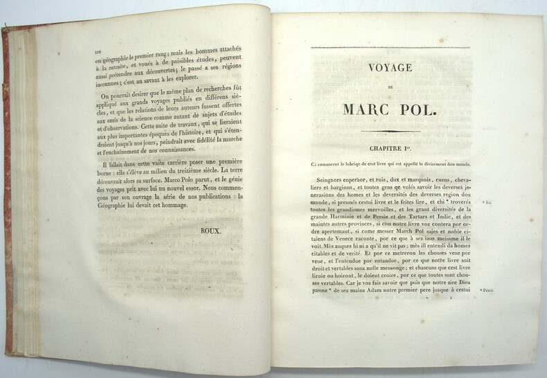 Édition princeps des Voyages de Marco Polo, la plus importante relation de Voyage jamais écrite. Malgré de nombreuses traductions depuis 1477, c est la première édition tirée de l’originale (vieux français) BNF MS.7367 et en même temps la plus importante traduction Latine BNF MS 3195 . Le texte français [.] publié par la Société de géographie de Paris en 1824 apporte la preuve qu'il s'agit d'une traduction originale. Cette Édition est plus importante que la traduction de Yule-Cordier et se signale par la correspondance et la justesse des noms propres. Contient aussi le texte Latin. Bon exemplaire de cette première édition de l’un des livres qui ont changé le monde. First edition of this monumental work. Very important and first edition from the original manuscripts of the BNF of the travel of Marco Polo .P1-4B