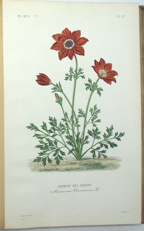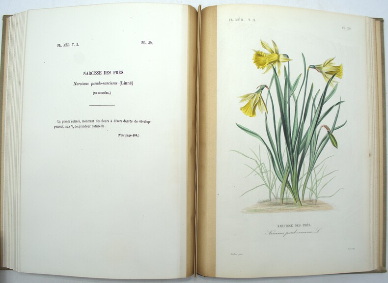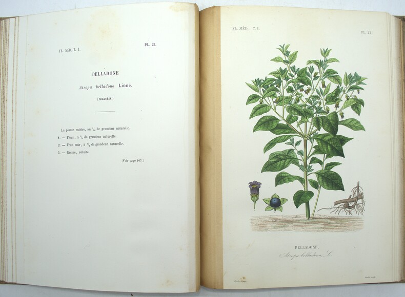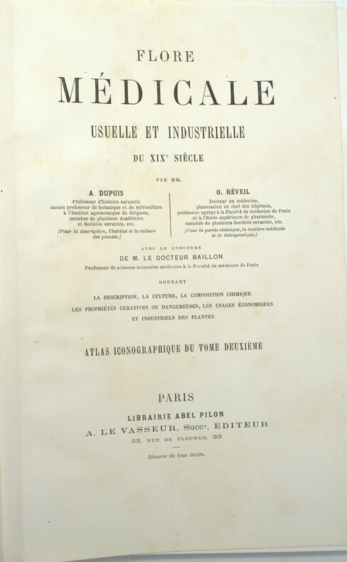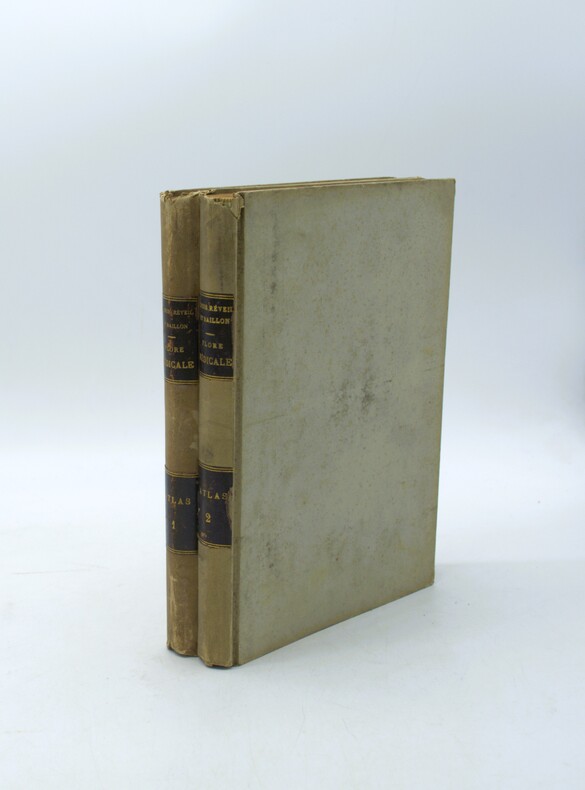 2 Atlas (sur 3), comprenant 50 planches chacun, en couleurs d’époque, liste de planches in fine. Édition originale des Atlas iconographique du tome 1 & 2, de ce joli ouvrage sur la flore médicinale, formant une des parties de l’imposante publication des auteurs dans les années 1860-1870, intitulée Le Règne végétal. Elle est illustrée de 100 planches montées sur onglets, gravées par Pierre, Lagesse, Lebrun, Corbier, Oudet et Noël, et rehaussées au pinceau par Gérard, Maubert et Legrand. Un texte explicatif accompagne chaque planche en regard. L’ouvrage résume les plus savantes recherches et les meilleurs travaux sur les végétaux au XIX siècle. Il a été composé par le botaniste Dupuis, le pharmacien Réveil et le docteur Baillon. Ch-3F