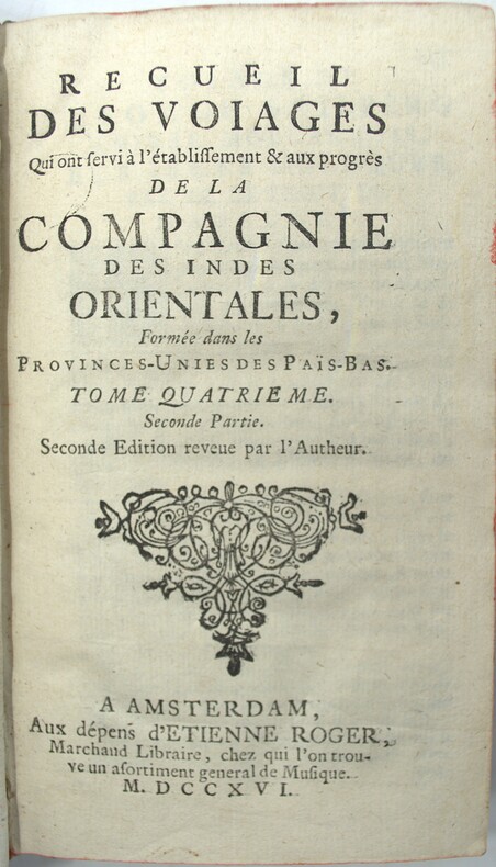 Tome 4, seconde partie de la seconde édition de René-Auguste de Renneville sur les voyages entrepris par le hollandais dans les Indes, on y trouve ; les voyages de Spilberg aux Isles Moluques par le détroit de Magellan, la navigation australe de Jacques Lemaire et le Voyage de Isbrantsz Bontekou. CH-3E