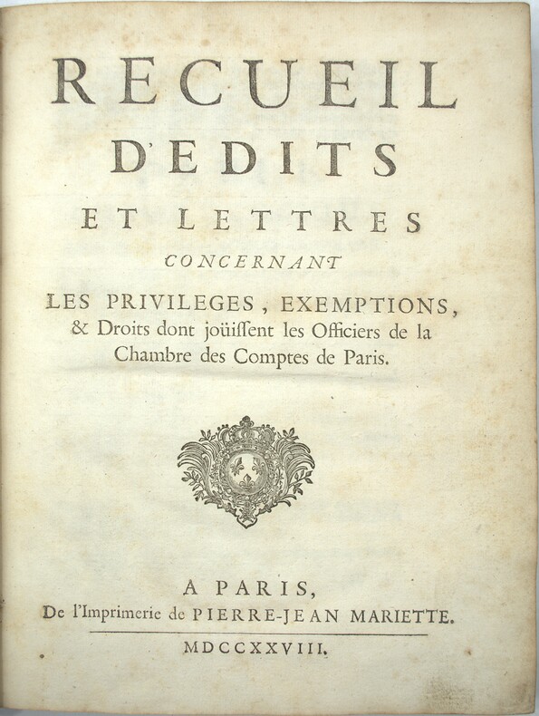 Recueil de 76 édits allant de Philippe de Valois à Louis XV. Ce recueil rassemble, sous forme continue, l’ensemble des édits, lettres patentes, déclarations, arrêts et règlements royaux qui définissent, encadrent et récapitulent les privilèges, exemptions et droits reconnus aux présidents, conseillers, auditeurs, greffiers et autres officiers de la Chambre des comptes de Paris, depuis l’Ancien Régime finissant des Valois jusqu’au début du règne de Louis XV. On y trouve notamment les textes relatifs aux exemptions fiscales (taille, aides, gabelles, droits seigneuriaux, corvées, logement des gens de guerre), aux prérogatives de rang et de préséance (dans les cérémonies, par rapport aux autres cours souveraines), aux garanties attachées à la vénalité et à l’hérédité des offices (modalités d’acquisition, de résignation, de survivance, droits des veuves et héritiers), ainsi qu’aux immunités de juridiction ou de police dont jouissent les officiers dans l’exercice de leurs fonctions. L’ouvrage constitue en pratique un code interne de la Cour des comptes parisienne, permettant aux officiers de disposer, dans un seul volume, des principaux actes normatifs qui fondent leur statut, leurs privilèges matériels et symboliques, et leurs rapports avec les autres institutions financières et judiciaires du royaume. P-Et1