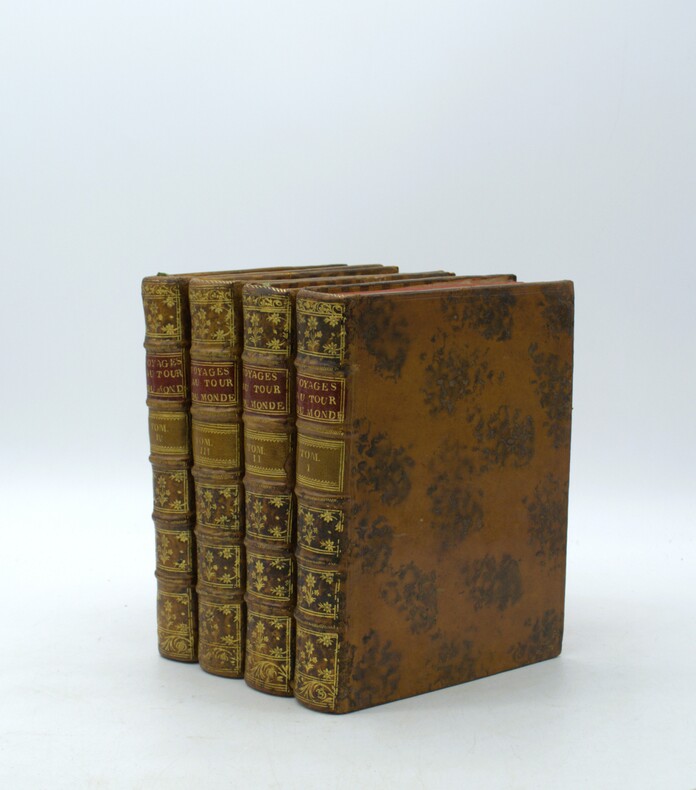 Paris, Saillant et Nyon, Panckoucke, 1774, 4 volumes in-4 (245x185mm), 2 ff., xviii, 1 ff., xxxii, 388 ; 3 ff., 536 ; 3 ff., 394, 1 ff.; 1 ff., viii, 367. Complet de ses 52 cartes et gravures. Basane tachetée époque, dos à nerfs orné avec pièce de titre cerise et tomaison havane, tranches rouges, doubles filets dorés aux coupes et doubles filets à froid aux plats, quelques épidermures, petit accroc au tome 2, quelques coins usés, 2 cartes avec déchirure au pli, titre court au 1er tome.