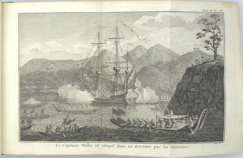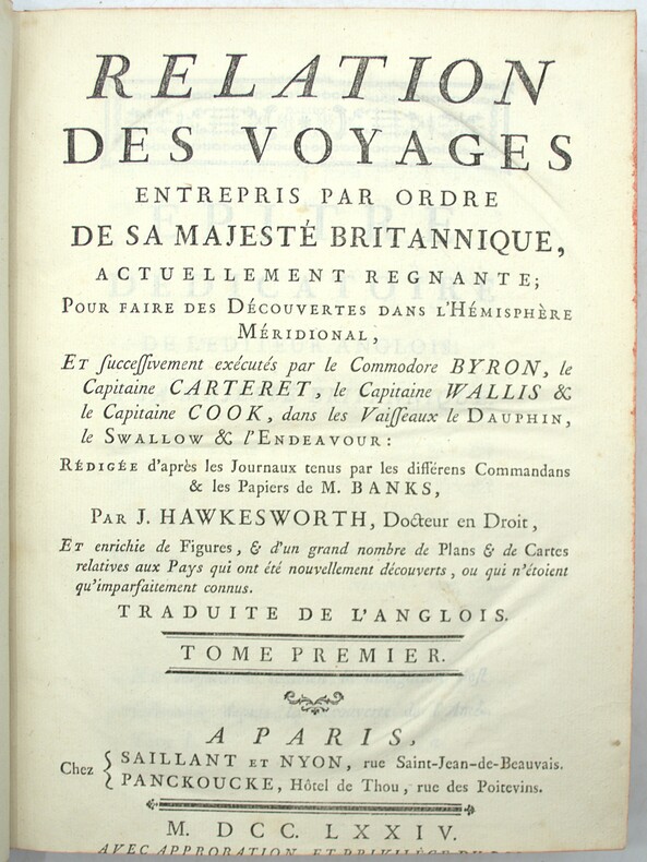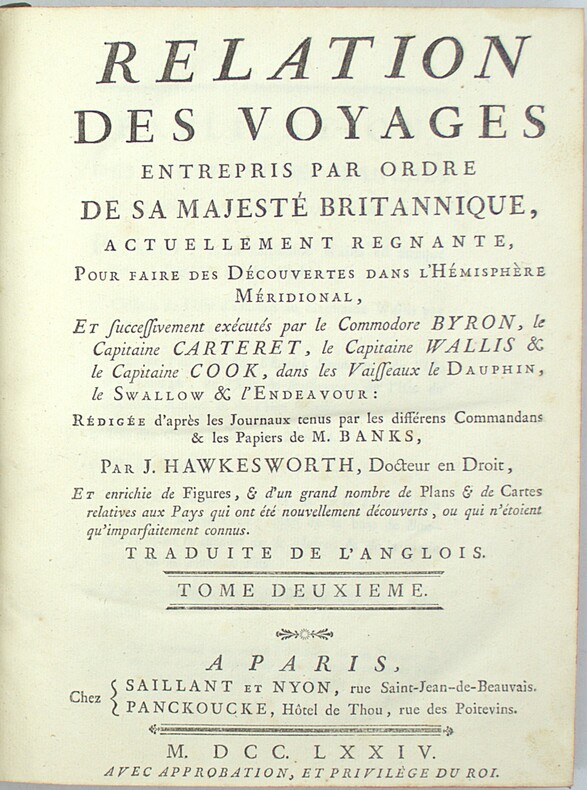 Second volume de la relation des voyages de Byron, Carteret, Wallis et Cook dans l’hémisphère sud, avec la fin du voyage du Capitaine Wallis et le début de la relation du voyage du Capitaine Cook.