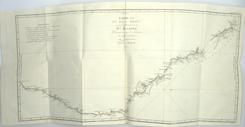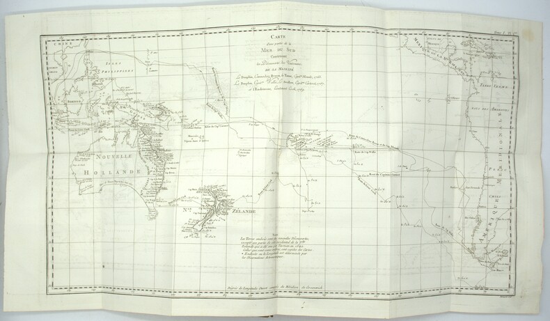 Atlas du 1er voyage de Cook comprenant 51 cartes et planches (sur 52), manque la planche 6 du 3eme tome (Vue de l’intérieur d’une maison d’Ulietea...), il accompagnait le récit du voyage de Wallis, Byron, Carteret et, bien sûr, Cook. Les graveurs sont Benard, Demonely, Dioret, Godefroi. Édition originale française du premier voyage de Cook dans les mers du Sud pour observer le transit de Vénus à Tahiti, mais aboutissant à la circumnavigation et à l'exploration de la Nouvelle-Zélande et à la découverte de la côte Est inconnue d'Australie Saillant et Nyon, 1774. 4to. 51 plates (52) many of which are folded or double-page, the engravers are Benard, Demonely, Dioret, Godefroi, a.o., (plates tightly bound). Almost complete illustrations and plates to the first French edition of Cook's first voyage to the South Seas to observe the transit of Venus at Tahiti, but resulted in the circumnavigation and exploration of New Zealand and the discovery of the unknown East Coast of Australia. Ch-1B