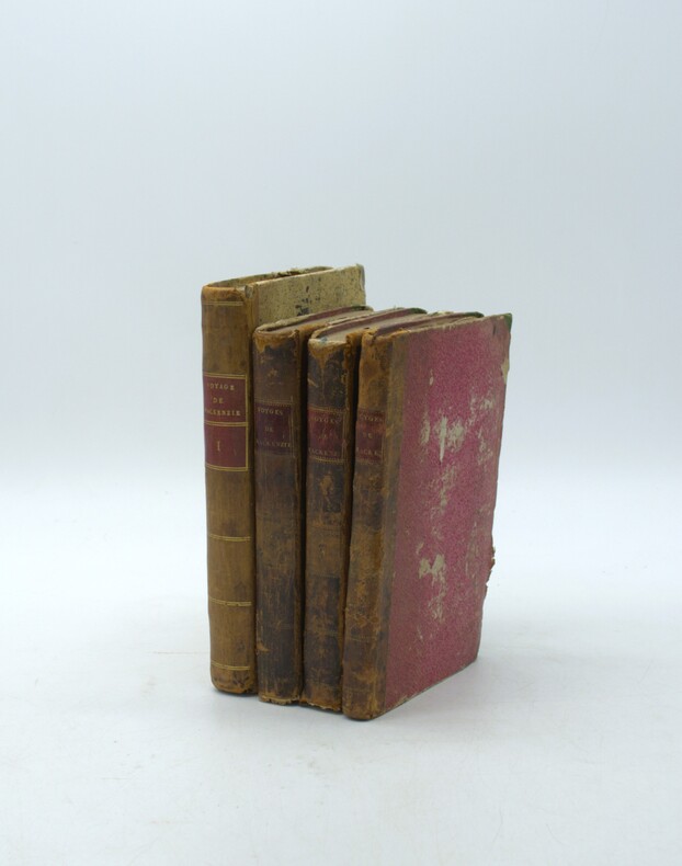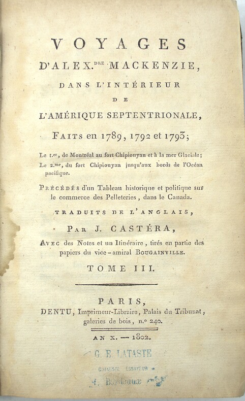 Paris, Dentu, an X (1802), 4 volumes in-8 reliés demi cuir, dos lisses ornés avec titre et tomaison, XX + 409 + 420 + 388 pages illustrées d'un portrait de l'auteur, en frontispice, par Laurence gravé par Adam, et de 2 grandes cartes sur 3 (déchirures, mouillures), le tome I contient un vocabulaire Algonquin, Knisteneaux et Chipiouyane et le tome 4 contient les cartes. Tome 1 reliure différente (non rogné), plats frottés, coins usés, charnières usées, coiffe arasée, bords de la reliure du tome 1 abimés, rousseurs, petite mouillure.