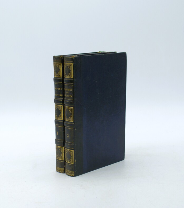 Médecin originaire de Grenoble, Antoine Clot, dit Clot-Bey fonda l’Ecole de médecine du Caire. Fin connaisseur du pays, il nous dresse un panorama complet et précis de l’Egypte en 1840, tant au niveau de la population, des lois et de la justice, des moeurs, du gouvernement, du commerce et de l’agriculture, que des transports, travaux publics et hygiène...Notre ouvrage ne contient pas le portrait mentionné par Brunet, par contre nous avons 5 plans & 2 cartes:Tome 1: Plan d’Alexandrie / Plan du Caire et de ses environs (dépl.) / Carte de l’Egypte, avec indication des villes anciennes par Jacotin & Jomard, (carte dépl. en couleur), Tome 2: (Plan de) Disposition des lieux / Plan de l’Arsenal d’Alexandrie / Plan des Barrages du Nil (dépl.) / Carte d’une partie du Delta. Gay, 1687; Brunet 28386 (un portr. + 5 cartes). Image disp.