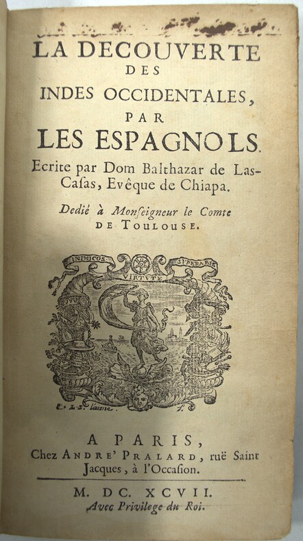 ÉDITION ORIGINALE DE LA TRADUCTION FRANÇAISE Première édition de la traduction française établie par l'abbé Jean-Baptiste Morvan de Bellegarde (1648-1734) de la célèbre Brevísima relación de la destrucción de las Indias de Bartolomé de Las Casas, parue à Séville en 1552. Texte fondateur sur la découverte et la conquête du Nouveau Monde, récit historique majeur de la rencontre brutale entre l'Europe et les Amériques. Bartolomé de Las Casas (1484-1566), dominicain espagnol devenu évêque de Chiapa, arrivé aux Antilles dès 1502 et témoin direct de cinquante années de colonisation, dénonce dans cet ouvrage les massacres, pillages et réductions en esclavage perpétrés par les conquistadores contre les populations indigènes d'Hispaniola, Cuba, Mexique, Guatemala, Pérou et autres territoires des Indes occidentales. Son témoignage accablant, fruit de son expérience personnelle de la conquête espagnole, contribua à la remise en cause du système des encomiendas et fit de lui le premier défenseur majeur des droits des peuples indigènes, protagoniste célèbre de la controverse de Valladolid (1550-1551) sur la nature juridique et théologique des Indiens. Bellegarde, écrivain prolifique et traducteur renommé, reconnaît dans son avertissement avoir « adouci en quelques endroits des choses qui paraissoient trop cruelles » dans le texte original, témoignant de la violence extrême des faits rapportés. Cette traduction propose six des neuf traités composant l'édition espagnole. Le frontispice gravé par Pierre Giffart fils représente Hernán Cortés et Montezuma II entourés d'Indiens collectant l'or et les richesses du Nouveau Monde, tandis qu'à l'arrière-plan apparaît une scène de torture infligée aux populations indigènes. Vignette gravée aux armes de Louis Alexandre de Bourbon, comte de Toulouse, fils légitimé de Louis XIV et Grand Amiral de France, dédicataire de l'ouvrage. Publiée peu après le traité de Ryswick (1697) qui consolide l'implantation française aux Antilles, cette édition s'inscrit dans le contexte géopolitique européen de la fin du XVIIe siècle où le texte de Las Casas sert d'argument moral et politique contre les méthodes espagnoles. Cette traduction connut un succès immédiat avec rééditions en 1698 et 1701, et fut rapidement traduite en anglais (Londres, 1699). First edition of the French translation by Abbé Jean-Baptiste Morvan de Bellegarde (1648-1734) of Bartolomé de Las Casas' famous Brevísima relación de la destrucción de las Indias, originally published in Seville in 1552. Foundational text on the discovery and conquest of the New World, major historical account of the brutal encounter between Europe and the Americas. Bartolomé de Las Casas (1484-1566), Spanish Dominican who became Bishop of Chiapa, arrived in the Antilles in 1502 and direct witness to fifty years of colonization, denounces in this work the massacres, pillaging, and enslavement perpetrated by the conquistadores against the indigenous populations of Hispaniola, Cuba, Mexico, Guatemala, Peru, and other territories of the West Indies. His damning testimony, based on his personal experience of the Spanish conquest, contributed to the questioning of the encomienda system and made him the first major defender of indigenous peoples' rights, famous protagonist of the Valladolid controversy (1550-1551) on the juridical and theological nature of the Indians. Bellegarde, a prolific writer and renowned translator, acknowledges in his preface having "softened in some places things that seemed too cruel" in the original text, testament to the extreme violence of the reported facts. This translation presents six of the nine treatises from the Spanish edition. Engraved frontispiece by Pierre Giffart fils depicting Hernán Cortés and Montezuma II surrounded by Indians collecting the gold and riches of the New World, while in the background appears a scene of torture inflicted on indigenous populations. Engraved vignette with the arms of Louis Alexandre de Bourbon, Count of Toulouse, legitimized son of Louis XIV and Grand Admiral of France, to whom the work is dedicated. Published shortly after the Treaty of Ryswick (1697) which consolidated French presence in the Caribbean, this edition fits into the European geopolitical context of the late 17th century where Las Casas' text served as a moral and political argument against Spanish methods. This translation enjoyed immediate success with reprints in 1698 and 1701, and was quickly translated into English (London, 1699). Ch-1A Références : Sabin 11273 ; Palau 46966 ; Leclerc 337