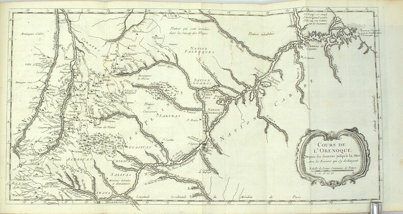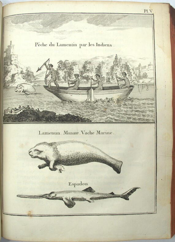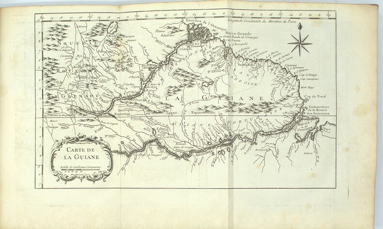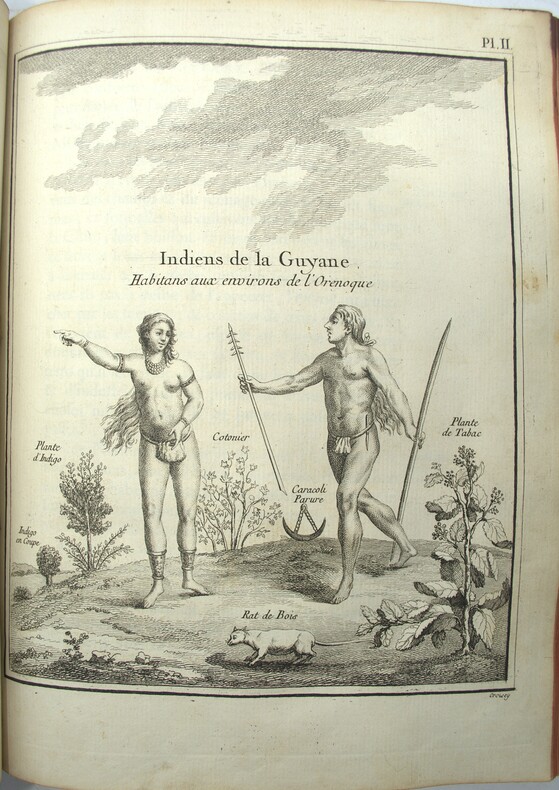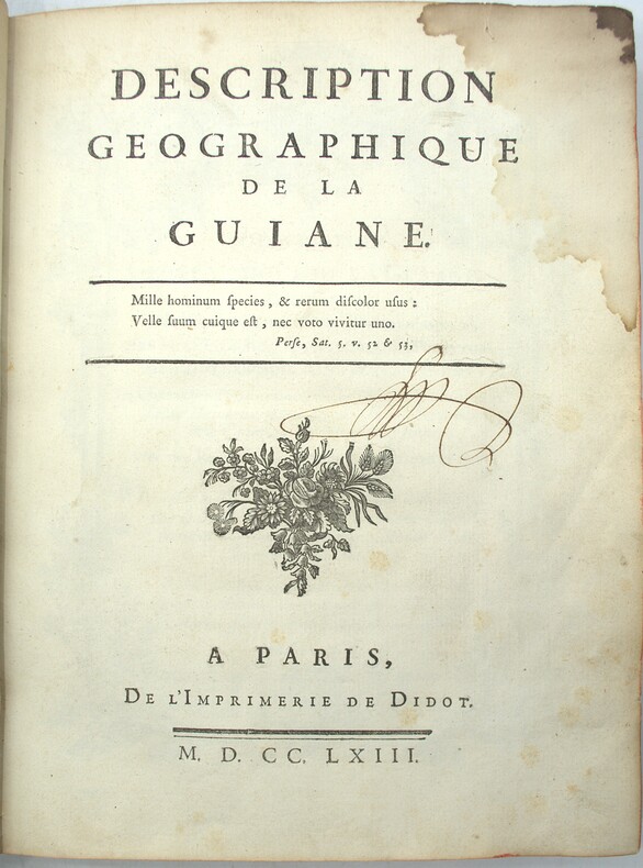 Paris, Imprimerie de Didot, 1763. Un volume in-4° (25 × 19 cm). (2) ff., XIV pp., (2) ff., 294 pp., (1) f. 20 cartes et 10 planches hors texte. Plein vélin vert d’époque, dos lisse. Mors fendus sans atteinte à la solidité, deux coins émoussés, taches au second plat. Tache d’encre ancienne affectant marginalement l’ensemble du volume, avec atteinte très limitée à quelques millimètres de quatre cartes ou planches. Quelques rousseurs. Exemplaire comportant d’importantes annotations manuscrites d’époque, apportant des observations pratiques sur la préparation des végétaux et des animaux, ainsi que sur la vie quotidienne en Guyane ; par exemple : « les Flamans : on en mange communément et ils sont meilleurs que les perroquets ». Ces notes constituent un témoignage direct venant compléter le texte savant. L’ouvrage est illustré de 20 cartes, dont 8 dépliantes (Guyane générale ; cours et parties du cours de l’Orénoque ; Surinam ; rivières de Poumaron, Demerary, Essequebo, Berbice, Corentyn ; embouchure des rivières de Coppename et Sarameca ; plan de Paramaribo ; côtes de la Guyane française ; Maroni ; Kourou ; île de Cayenne ; Aprouague ; Oyapock et Couribi ; Guyane portugaise ; port et plan de Cayenne), ainsi que de 10 planches gravées par Croisey représentant habitants, animaux et plantes. Exemplaire complet.