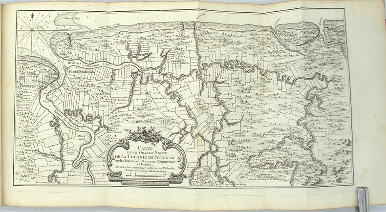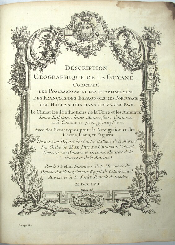Publié sous l’autorité du Dépôt des cartes et plans de la Marine, l’ouvrage s’inscrit dans le vaste programme de documentation coloniale mené sous l’impulsion de Étienne François de Choiseul. Il constitue l’une des synthèses les plus complètes consacrées à la Guyane au XVIII siècle, tant du point de vue géographique qu’hydrographique et économique. Jacques-Nicolas Bellin, géographe et hydrographe du roi, incarne le modèle du cartographe de cabinet : n’ayant jamais voyagé, il élabora néanmoins, à partir des rapports de navigateurs et d’ingénieurs, une somme cartographique de premier ordre. Les annotations manuscrites présentes dans cet exemplaire confèrent à ce travail érudit une dimension d’expérience vécue, particulièrement rare. M1-Et1