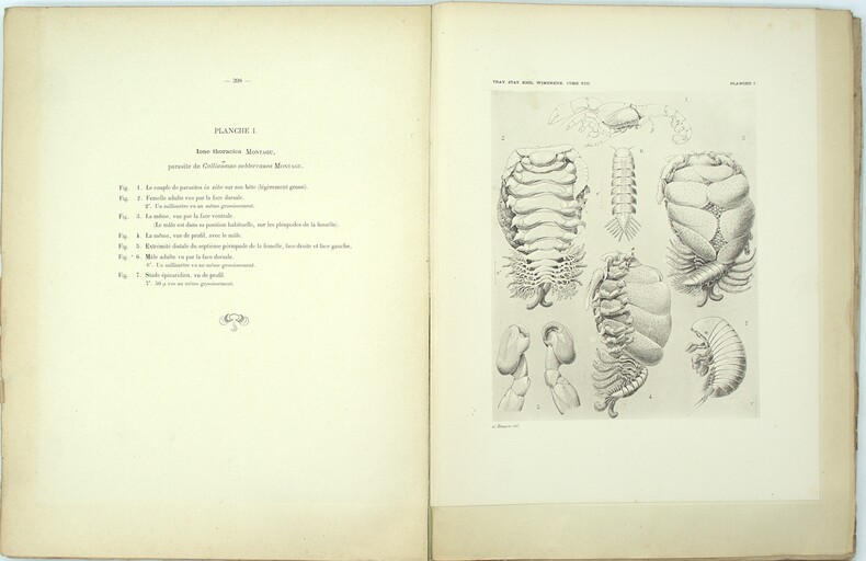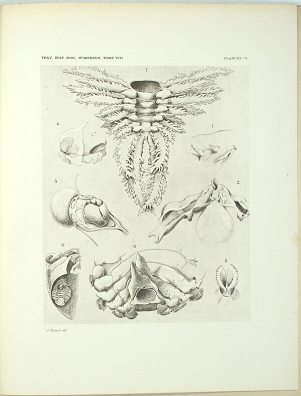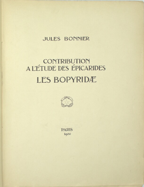 Importante monographie consacrée aux Bopyridae, famille de crustacés isopodes parasites (Épicarides), fondée sur les observations et collections de la Station zoologique de Wimereux. L’ouvrage constitue l’étude de référence de Jules Bonnier sur ce groupe, tant du point de vue morphologique que systématique, et s’inscrit dans les travaux développés à Wimereux autour d’Alfred Giard, dont Bonnier fut l’un des principaux collaborateurs. Les 41 gravures illustrent de manière détaillée l’anatomie, les stades parasitaires et les caractères diagnostiques des espèces étudiées. A monograph devoted to the study of the Bopyridae, a family of parasitic isopod crustaceans within the Epicaridea. Based on research carried out at the Wimereux Zoological Station, this work represents Jules Bonnier’s principal contribution to the morphological and systematic study of the group. The engravings provide detailed documentation of anatomy, parasitic forms, and diagnostic characters used for classification. Ch-1C