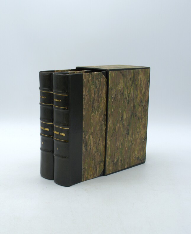 Grammaire Arabe d'Antoine-Isaac Sylvestre de Sacy, publiée en 1810 en deux volumes par l'Imprimerie impériale, constitue la première grammaire arabe scientifique en langue française et l'ouvrage fondateur de l'orientalisme moderne. Conçue pour les élèves de l'École spéciale des Langues orientales vivantes où Sylvestre de Sacy (1758-1838) enseignait, cette grammaire méthodique de l'arabe classique rompt avec les approches antérieures en appliquant une rigueur scientifique et une pédagogie adaptée aux étudiants occidentaux. Fruit de l'érudition exceptionnelle de son auteur, autodidacte devenu le plus grand arabisant de son temps, l'ouvrage servit de référence incontournable pendant plus d'un siècle dans toute l'Europe, formant plusieurs générations d'orientalistes et contribuant décisivement au développement des études arabes et orientales en Occident dans un contexte d'expansion coloniale et d'intérêt croissant pour le monde arabo-musulman. Cachet humide, très effacé et ayant perdu son encre, « Institut Égyptien Alexandrie », ayant existé entre 1859 et 1880, date de son déménagement au Caire. M6-B